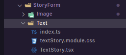 In StoryForm, create a folder called Text, in that folder, create 3 files: index.ts (our entry file), textStory.module.css, and TextStory.tsx.