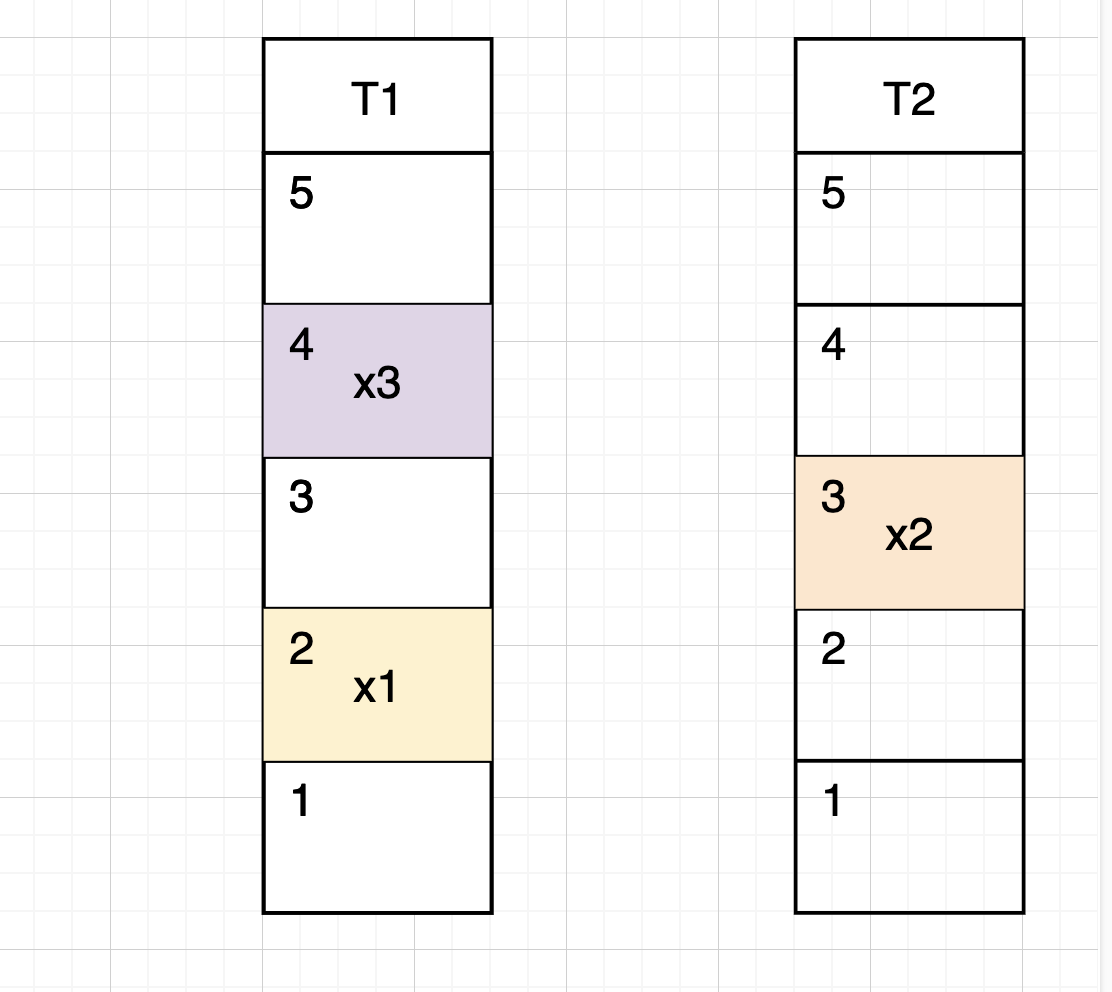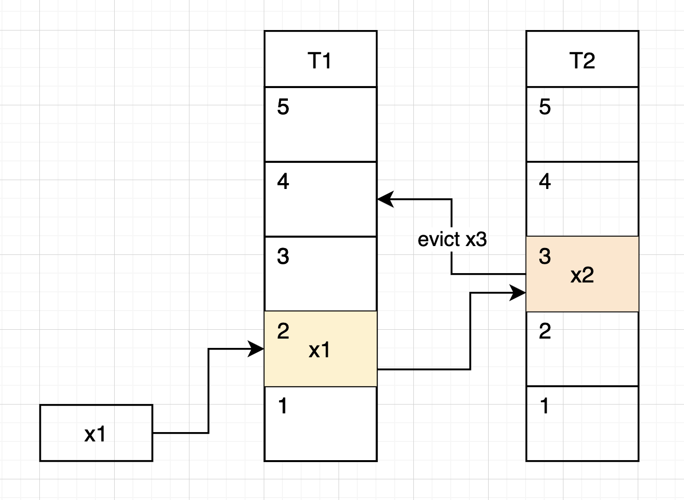 Unfortunately, the bucket (3) in $T_2$ is already occupied by $x_3$