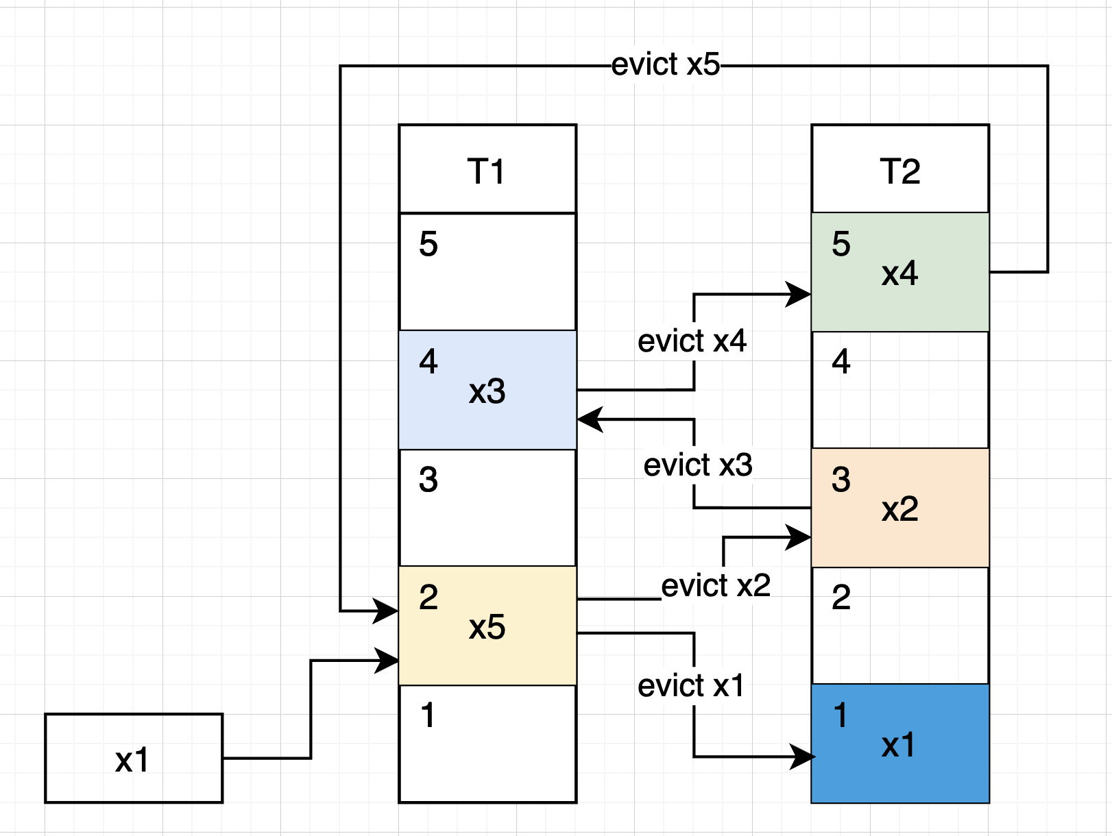 In this case, the $x_5$ eviction leads to place $x_5$ to bucket is taken by $x_1$, and rehash $x_1$ again using $h_2(x_1)$ leads to empty slots in $T_2$ (remember that at the beginning we hash $x_1$ using $h_1(x_1)$ )