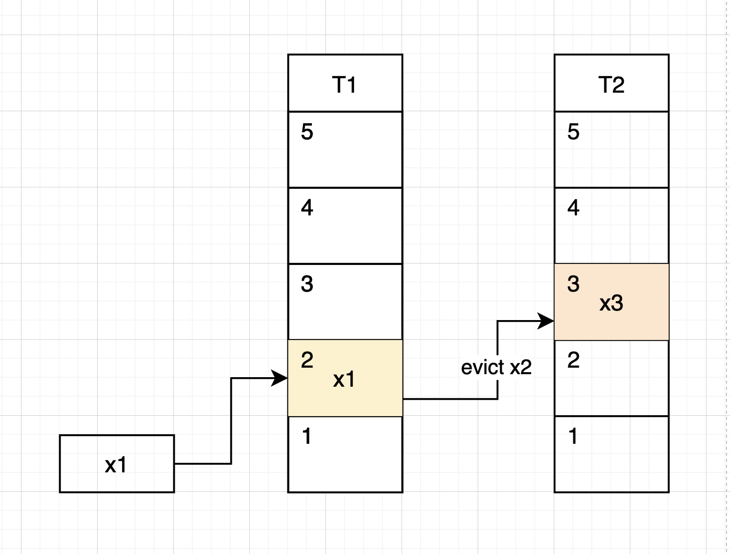 The bucket (2) is already taken by $x_2$, so we evict it by hashing it again using $h_2(x_2)$ to find the bucket to place $x_2$ in $T_2$ and its new bucket is bucket (3) in $T_2$
