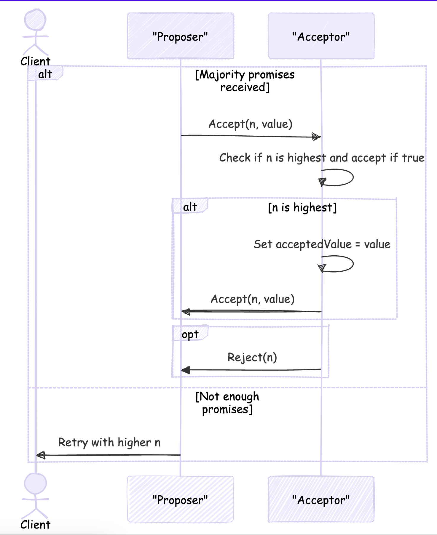 nis still the highest proposal number it has seen. - If n is still the highest, the acceptor accepts the proposal.