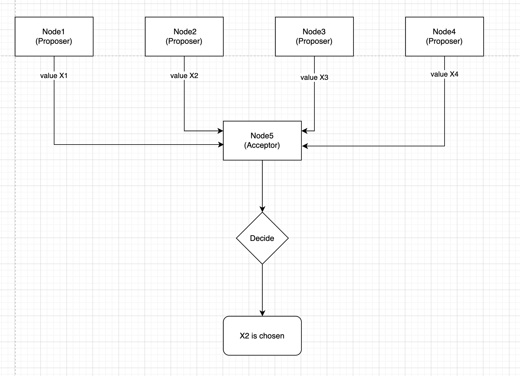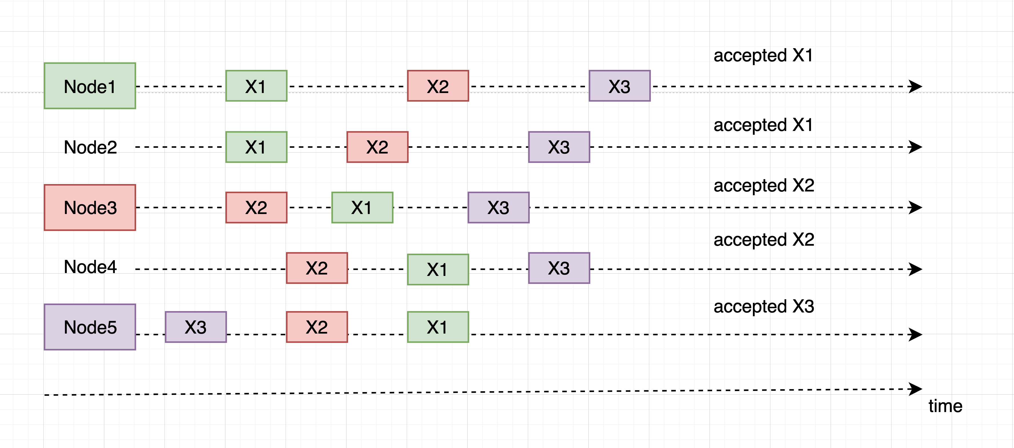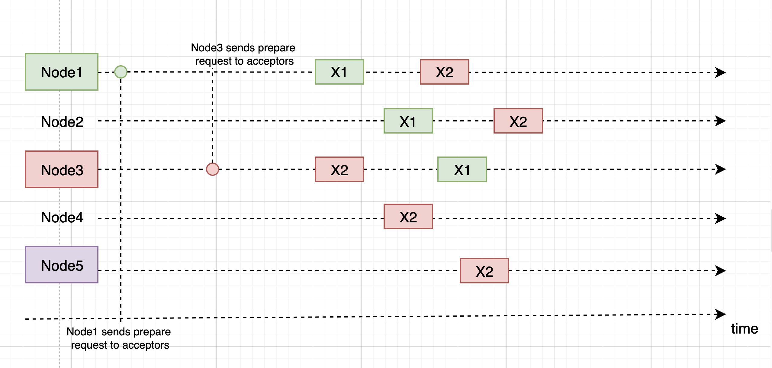 In this scenario, each node acts as both a proposer and an acceptor simultaneously. Each block represents the proposal to propose for the value. The timing of proposal arrivals matters—pay close attention to where the block is, as it indicates when an acceptor receives a proposal. Since an acceptor must accept the first proposal it receives, this can lead to a situation where no single value is accepted by a majority. Instead, different acceptors may accept different values, preventing consensus. In this example, X1 is accepted by Node1 & Node2, X2 is accepted by Node3 & Node4, while X3 is accepted by Node5 . Hence, there’s no value which is chosen by majority (3 nodes)