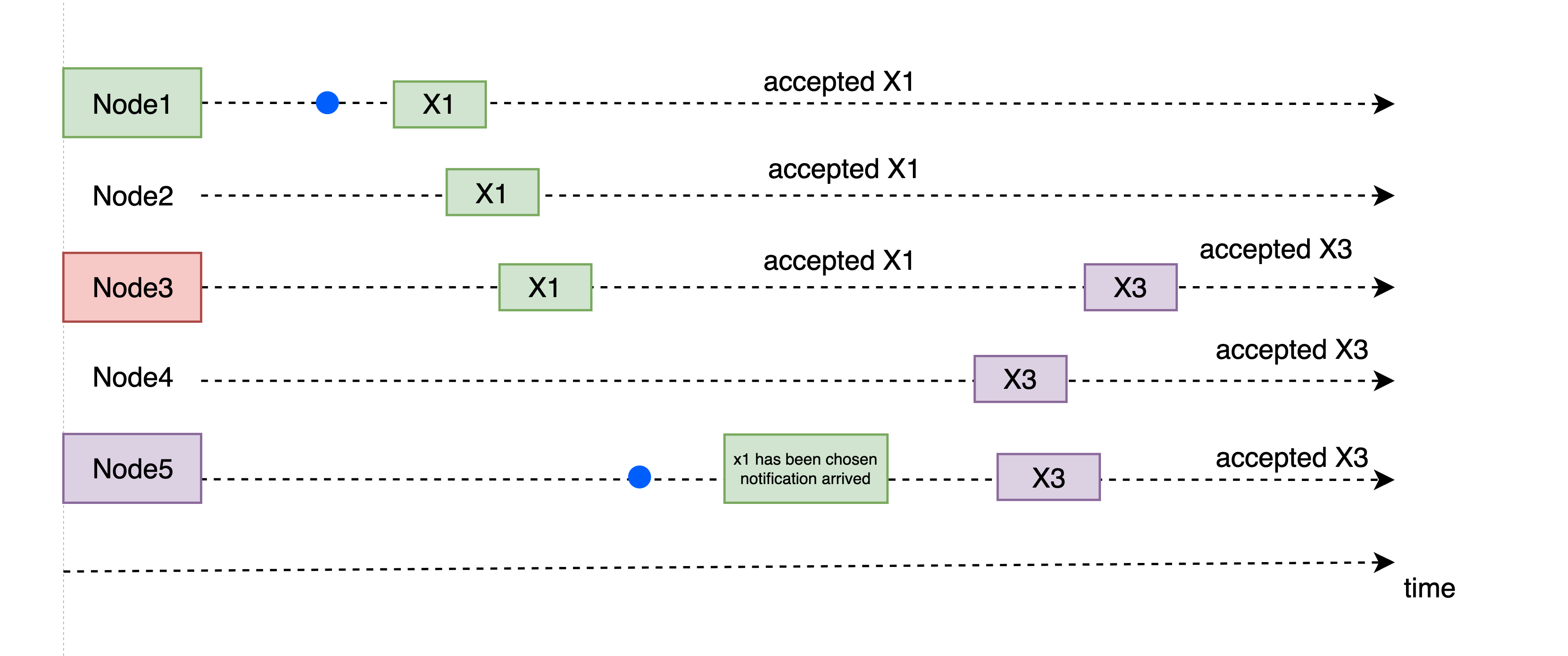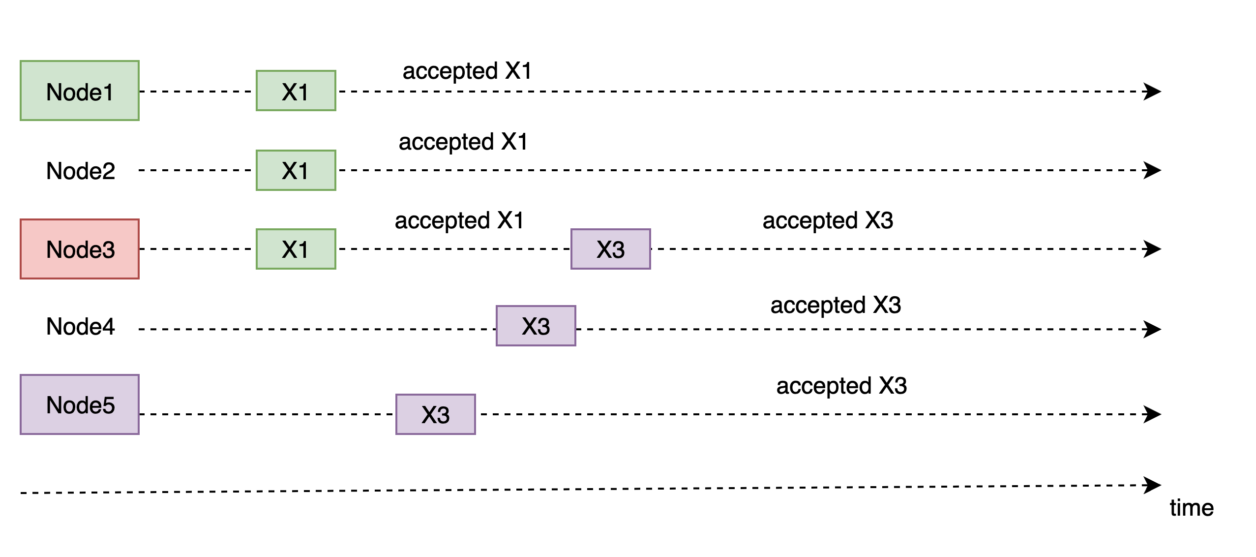 Right after that, Node5 also wants to propose value X2, it requests the accept from Node3, Node4, and got accepted → Quorum met (Node3, Node4, Node5) → X3 is chosen.