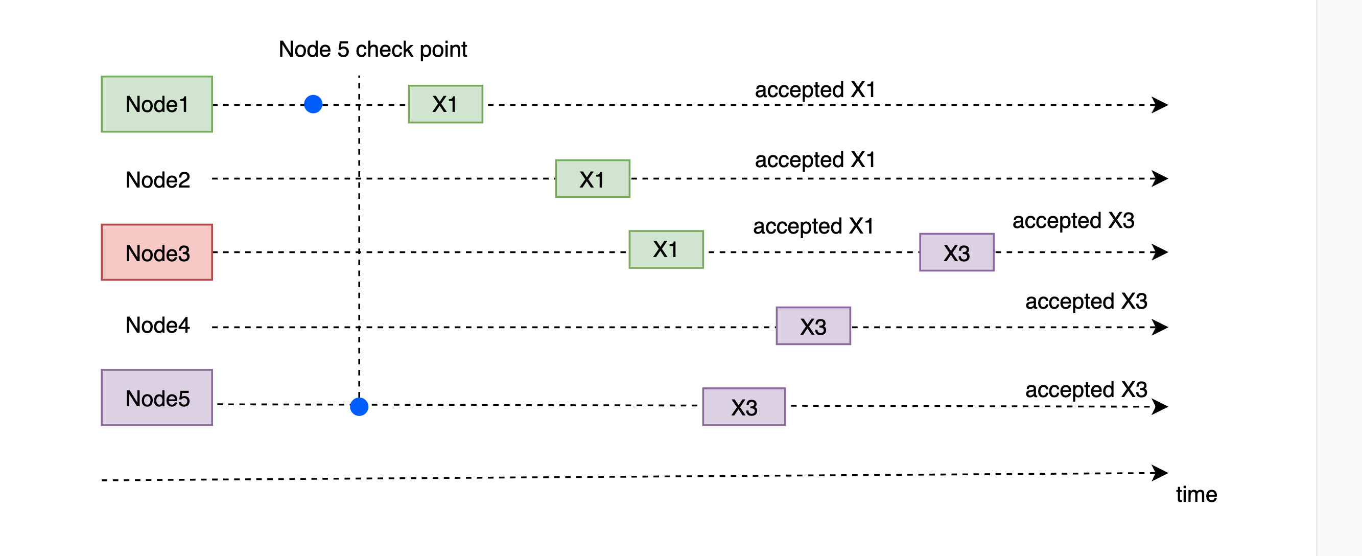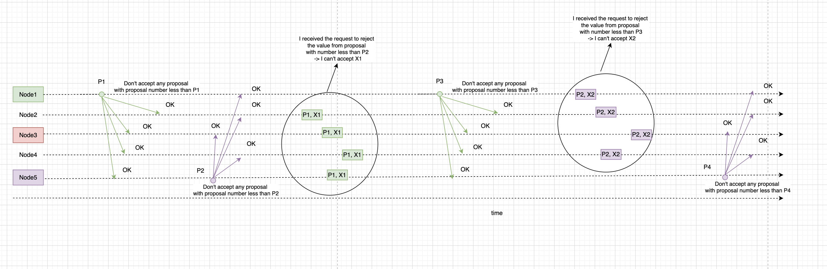 Node5requests to check if there’s any value chosen by majority of nodes? This won’t work in following situation. At the timeNode5wants to propose value (the blue dot), it check with other acceptors and there’s no value accepted by majority then it also sends its proposal.