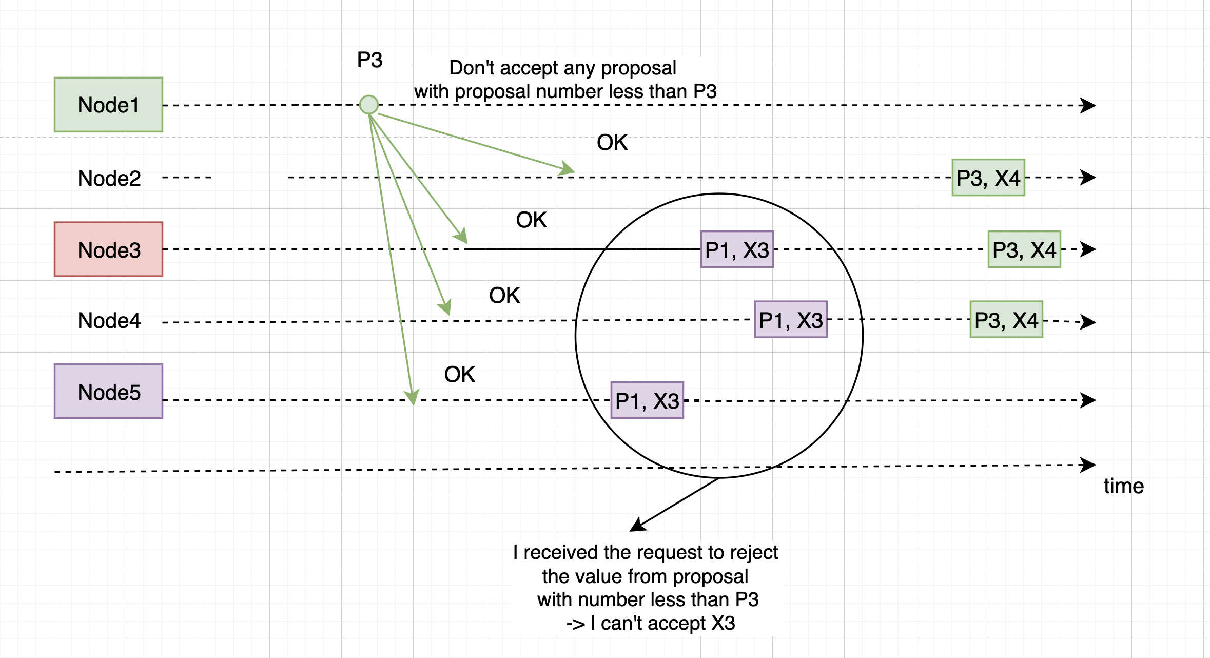 Node1still proceeds to sendAccept(X4)toNode2,Node3, andNode4, which also gets accepted (perhaps with Proposal #3). As a result, two different values (X3andX4) both appear to be accepted by a majority, creating a conflict.To resolve this, at the time we send prepare request, we must send out the proposal number, and force all acceptors to not accept any value (or even prepare request) of any proposal with lower proposal number.