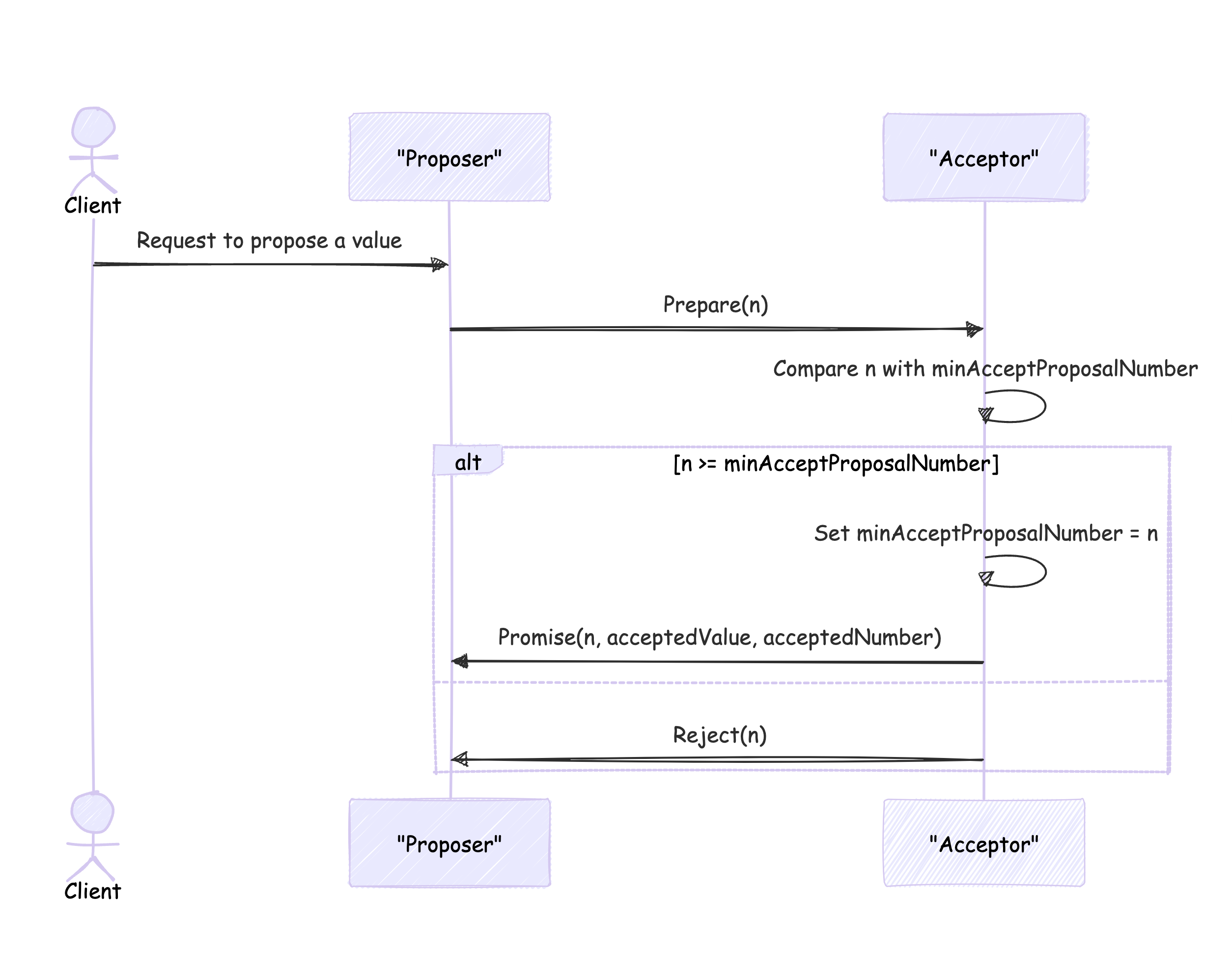 - The proposer sends a Prepare(n) request to all acceptors, where n is a unique and increasing proposal number.