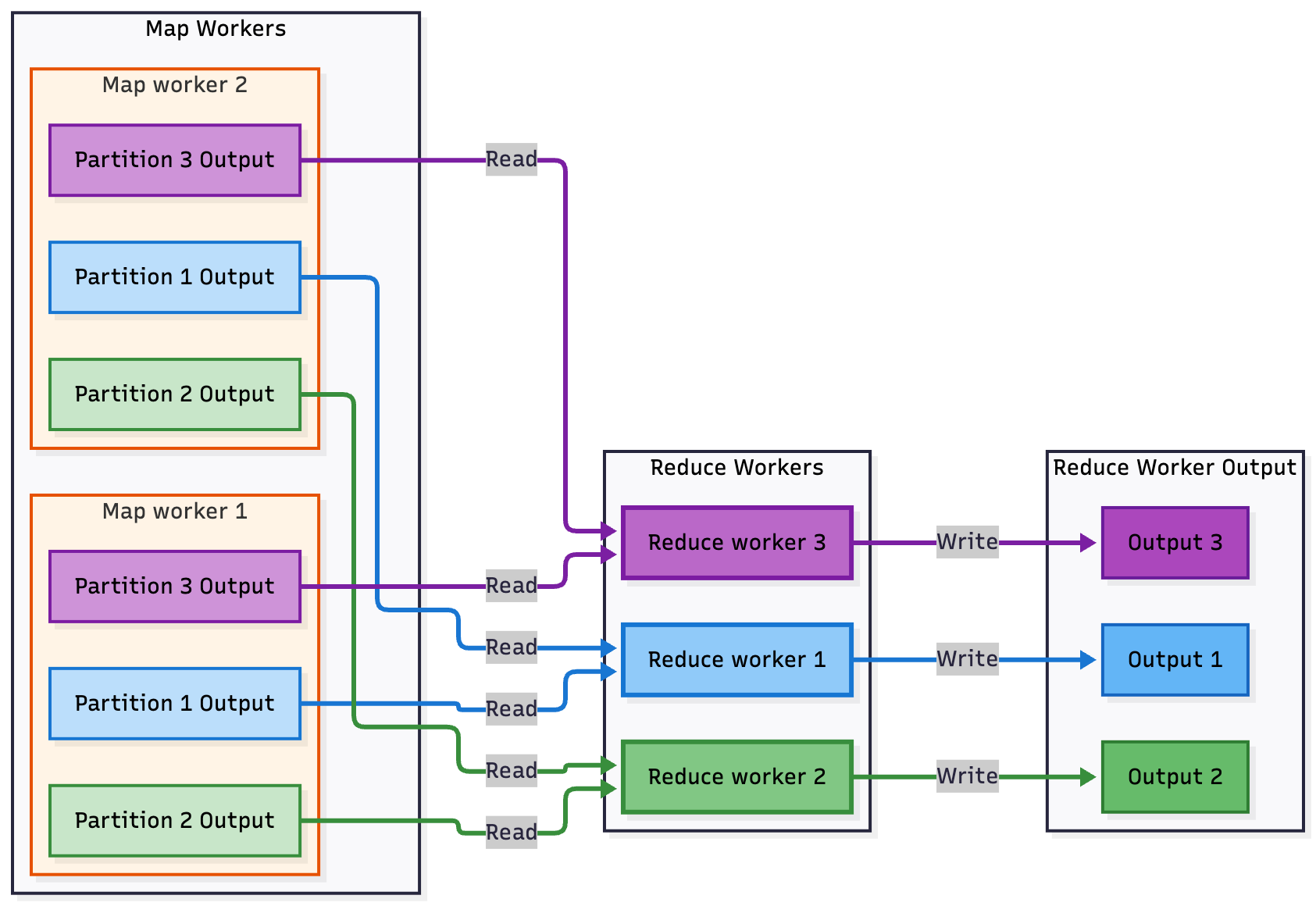 - The sorting step is crucial as it allows the reduce worker to process one key at a time without holding the entire dataset in memory. As soon as all values for a key are processed, the reduce worker can safely write the aggregated result to disk. This streaming design keeps memory usage low and produces sorted output naturally.