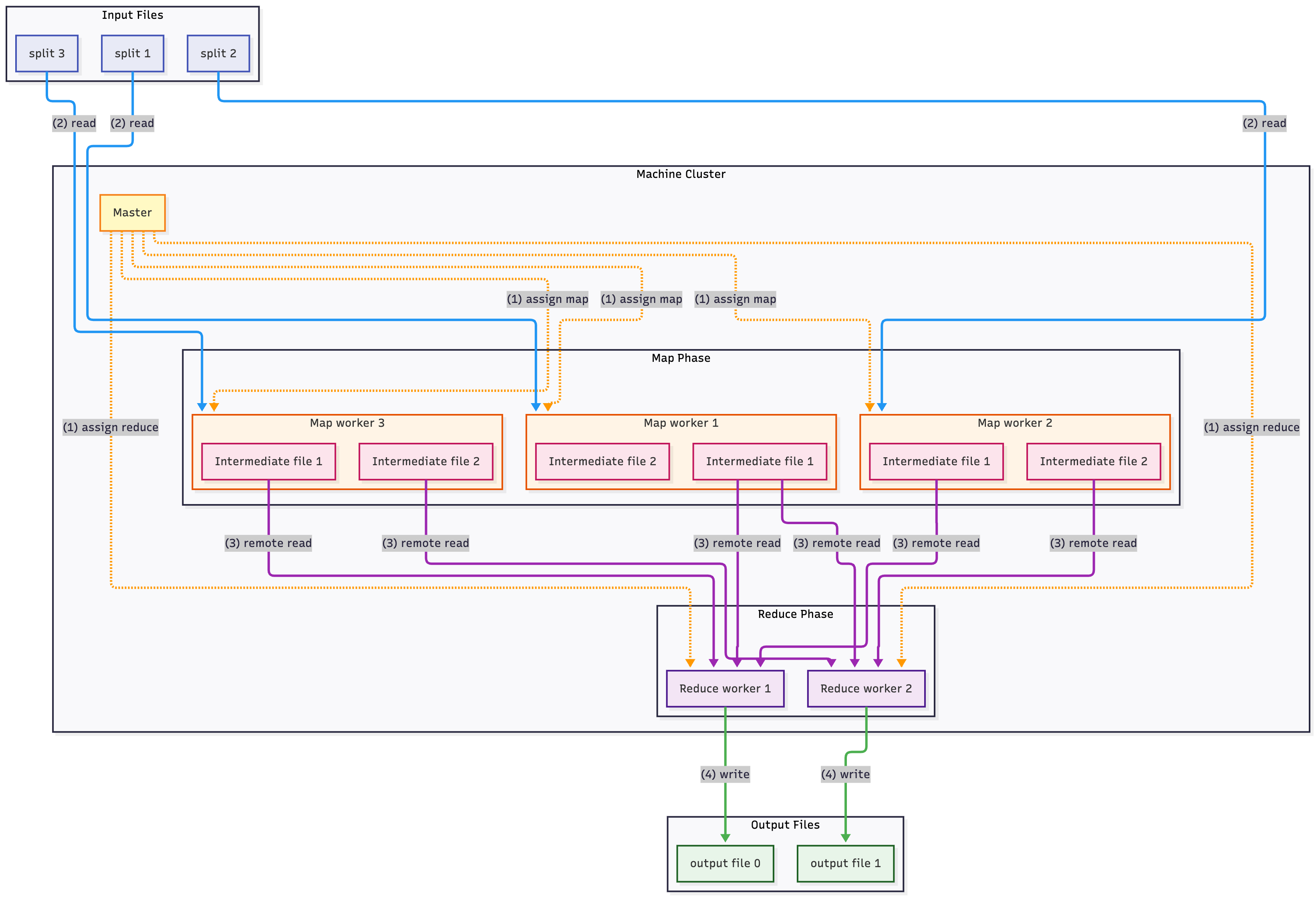 - External sort: In the paper they did not reveal the detail implementation, but I guess it sorts data in memory-sized chunks, writes them to disk, and then merges them into a single sorted stream. This allows reduce workers to handle massive datasets efficiently, using only sequential disk reads instead of loading everything into memory. Maybe something similar to Merge Sort
