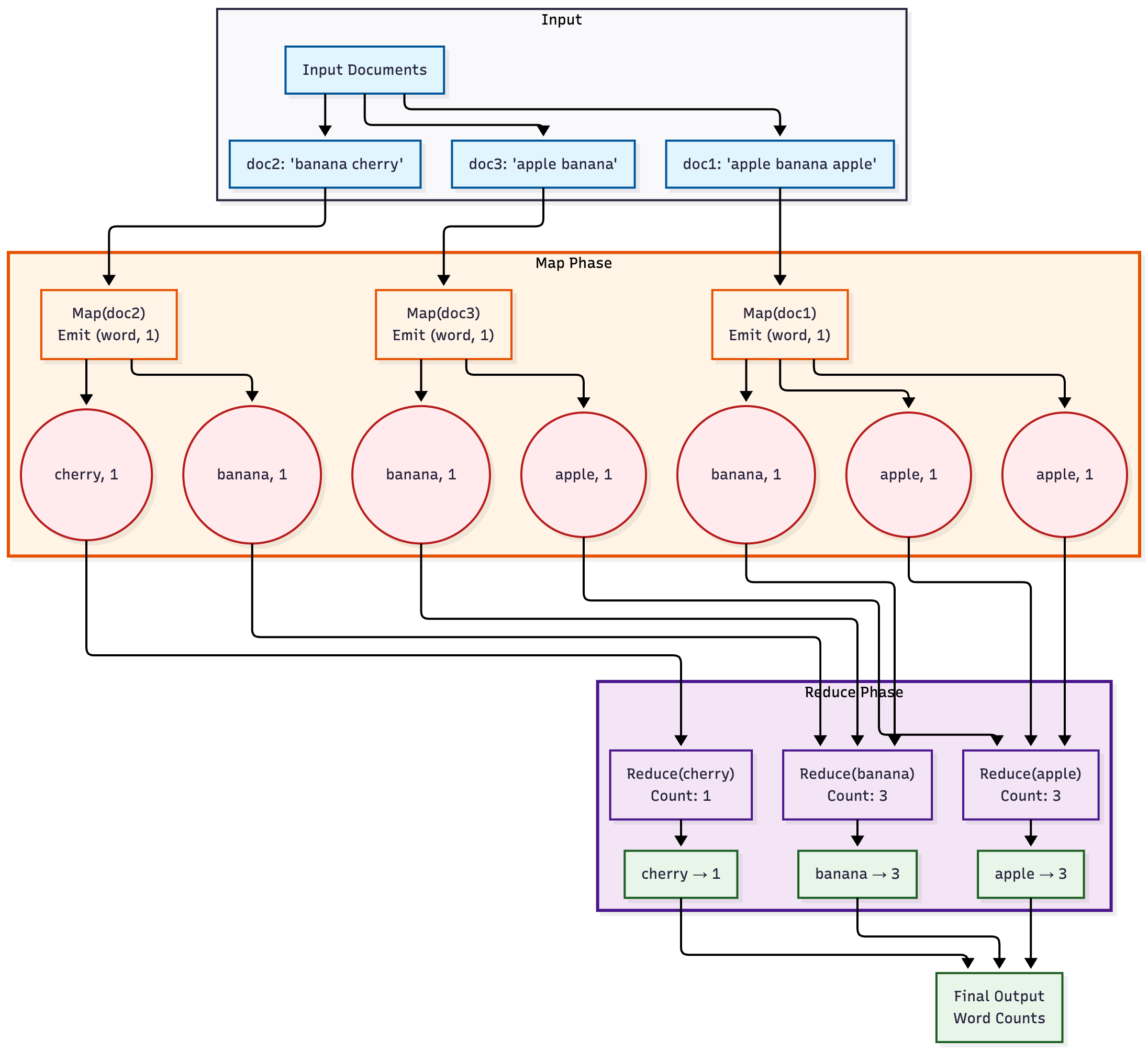 - Reduce: function that receives a key and the list of all associated values, merging or aggregating them into a smaller result (typically zero or one output value). To handle large datasets efficiently, these values are streamed to the reducer through an iterator rather than loaded entirely into memory.