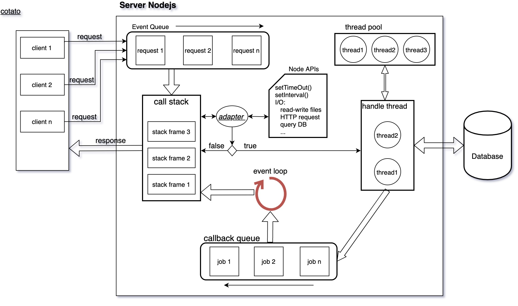 - Some might wonder, how could it be possible that a NodeJS application can handle thousands of requests while it only has 5 threads in total? The point here is “callback”. When a thread (A) in the thread pool picks up a task, it will interact with other I/O subsystems like a database (for example). And note that, the database also provides some threads (B) itself, so thread A just comes in and says “hey, database, I need to get some data in the database, but I won’t wait for you to find and give it back to me, instead I will leave a “callback” here, call it when you’re done with your job, I will go back to pool and pick up another job”. Once the database’s done its job, it will call the callback function and send the response back to the callback queue, and when the call stack is empty, the event loop will pick from the callback queue to the call stack to continue to handle the request.