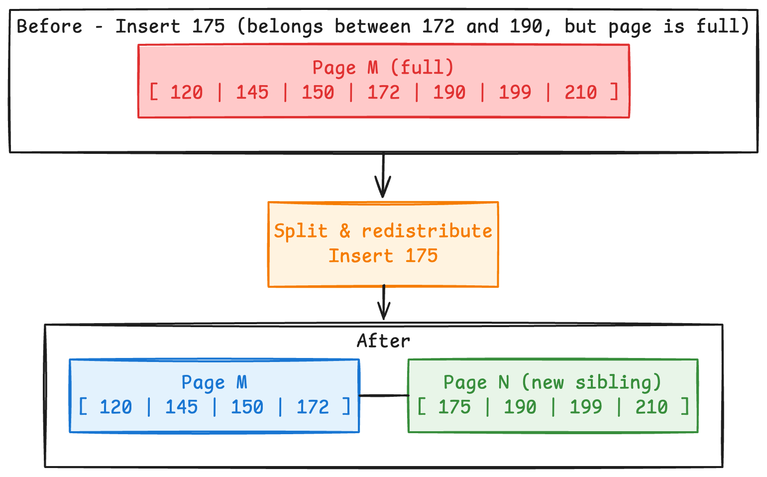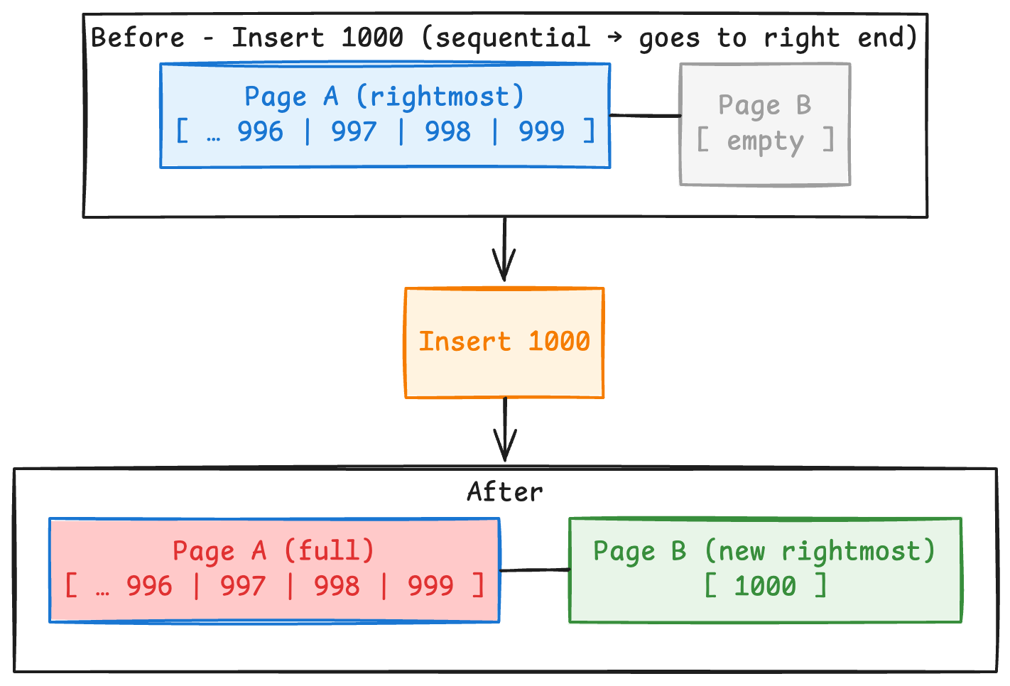 InnoDB, every index is built on fixed-size pages (e.g.,16 KBeach). When you insert or update a row, the database tries to place the new data directly inside the page that covers its key range. Let’s say we want to insert a new row. If the page still has space left enough to store the new data, we’re good, the data is stored to the page immediately. But what if we don’t have enough space? In this case 2 scenarios:- If it’s sequential inserts (e.g: auto-increment primary keys, time-based UUIDs). In this case, we know that the new record will always belong in the rightmost page! Given that fact,