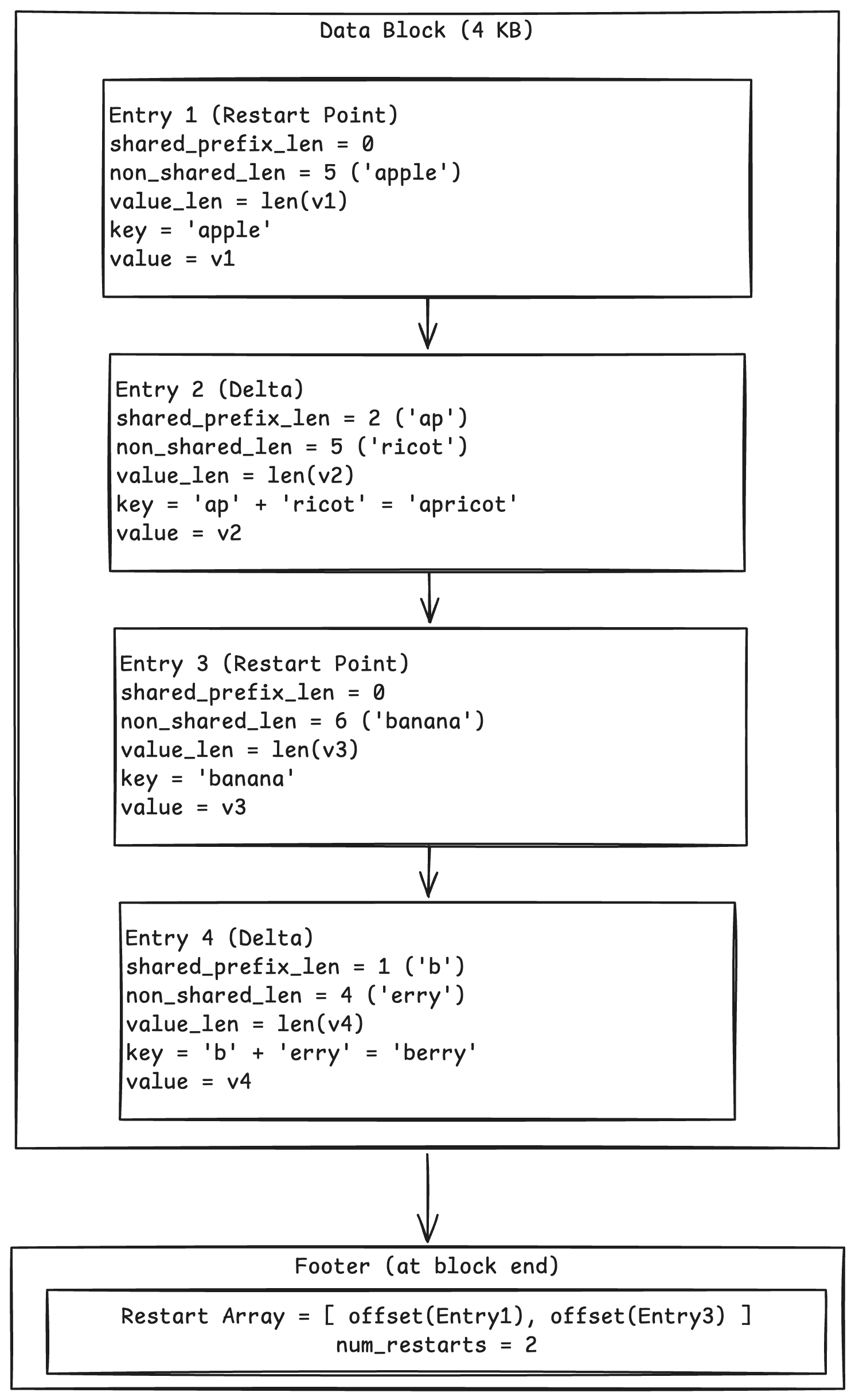 Entry4from above example. You must find the nearest restart point (using the metadata stored in the footer of block). In this case, it’sEntry3, decode it, then build the key forEntry4. In real life, the chain might be longer, like, if we getEntry10but the nearest restart point isEntry2, then we must decode all the entries fromEntry2toEntry10!
