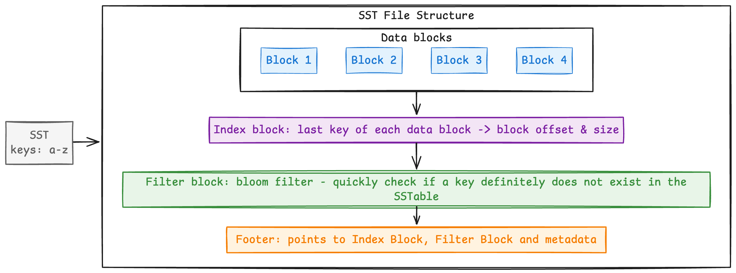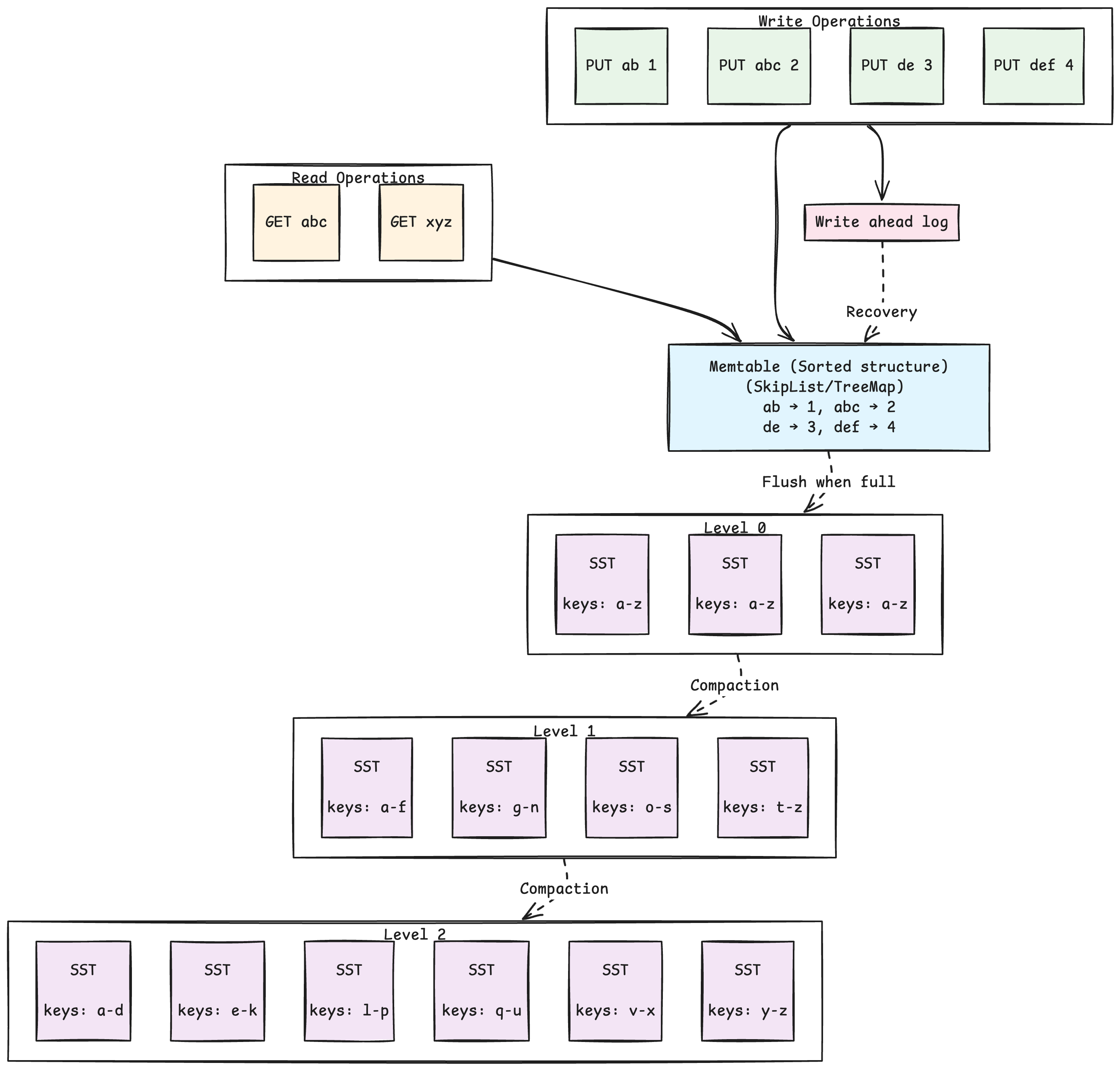 SSTables(on disk): Once the content ofMemTablereaches a predetermined size, it’s flushed to disk as an immutable, sorted file (SSTable). No in-place updates are needed. Each of the SSTs stores data in sorted order.- Compaction: As