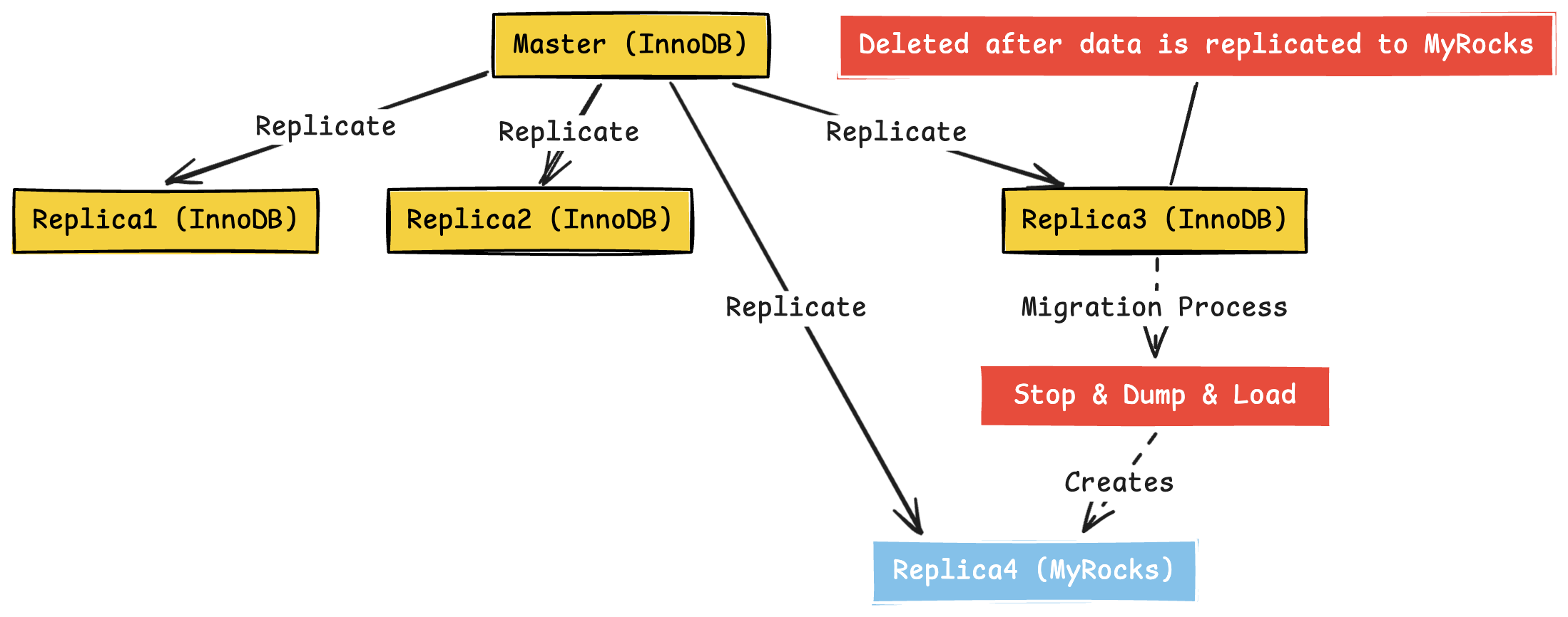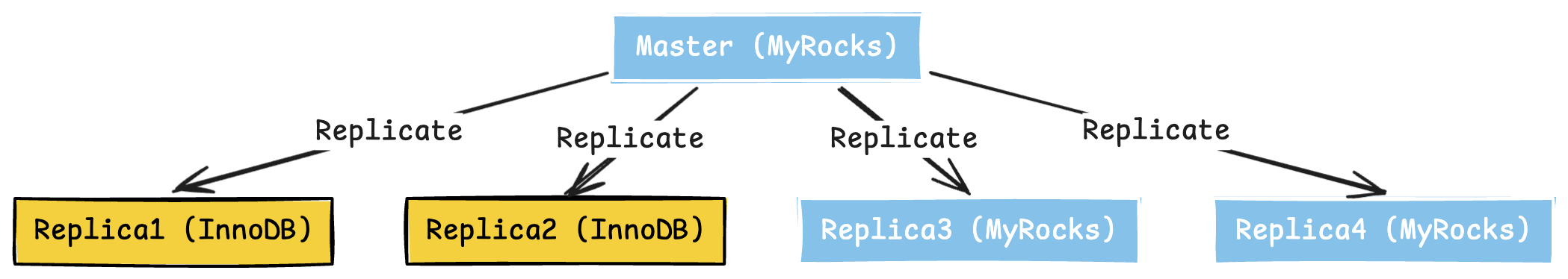 MyRocksinstance is not idea since losing that instance means dumping and loading again. So they add 2MyRocksinstances (and at the same time, delete 2InnoDBinstances) in the replica set.