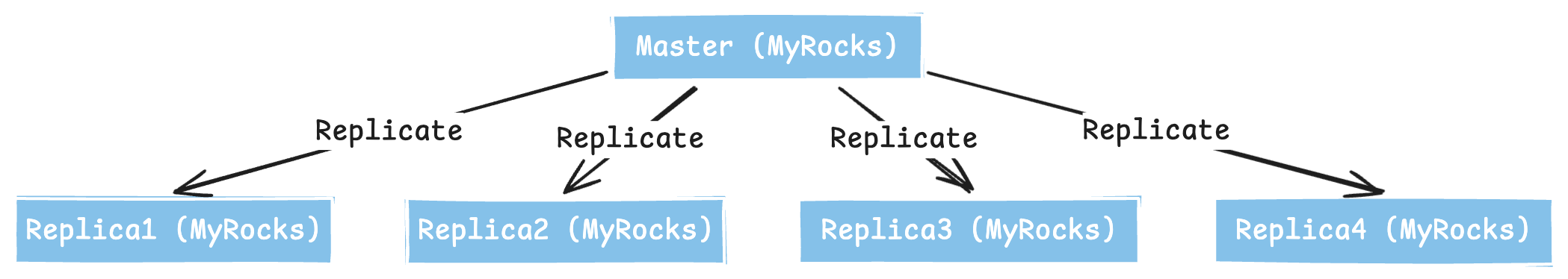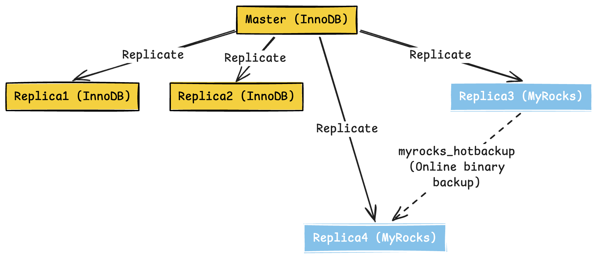 - Deploy the first MyRocks secondary: For each replica set, they have 1 master and 3 replicas, they use one of these 3 replica (or secondary) as InnoDB source, stop receiving read requests for that replica, then export the data (via