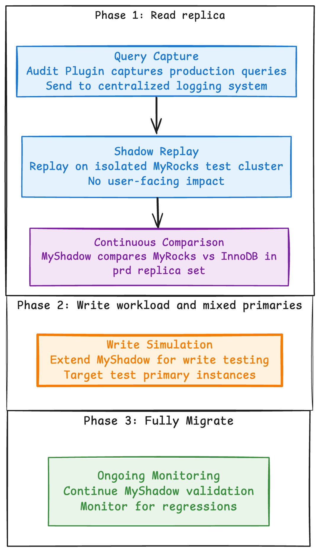 MyRocksreplicas continuously replicated the live updates form theInnoDBprimary, but they only served read traffic. During this phase, MyShadow (a system for shadow production queries - which we will talk about a bit later) is heavily utilized: Production read queries were shadowed and replayed on theMyRocksreplicas, their behavior was monitored and compared to theInnoDBreplicas. In the meantime, Data Correctness pair checks (another toolkit to ensure the data correctness - again, we’ll go into detail in the next section) were run between theMyRocksandInnoDBreplicas to ensure their data remained in sync.- This phase lasted for a few months, until