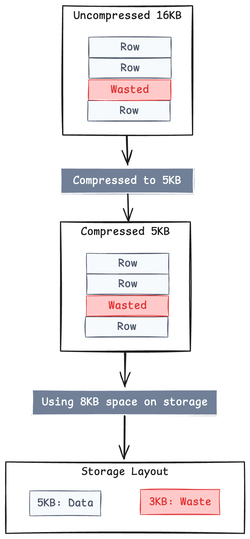 But this leads to an issue that, if the KEY_BLOCK_SIZE is 8KB, even if 16KB data was compressed to 5KB, the actual space usage was still 8KB, so eventually, we still use 8KB, not 5KB, resulting storage saving was capped at 50%!