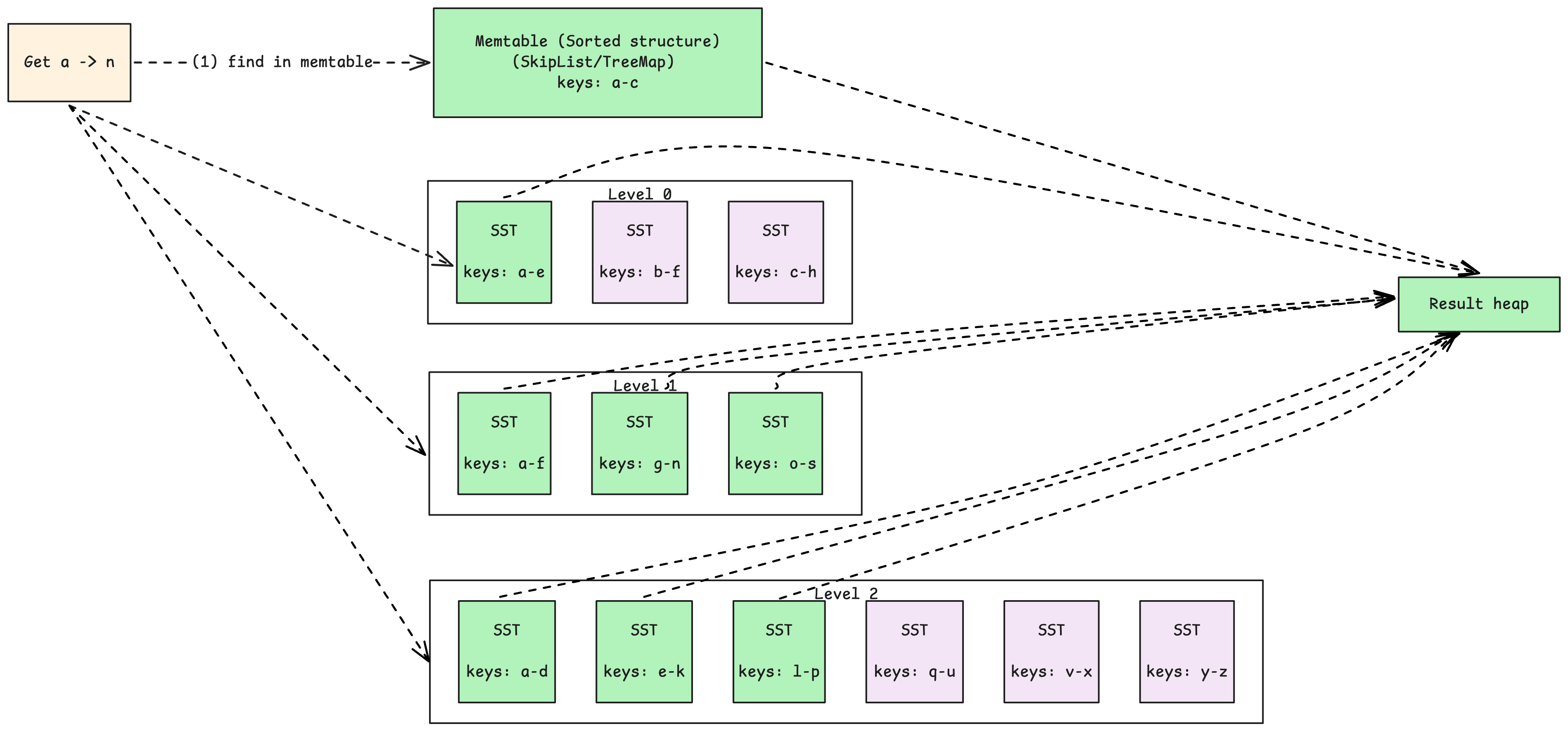 To start a range scan, RocksDB binary-searches each overlapping SSTable at every level. If an SSTable has keys in the range, its first matching key is added to the heap. In the example above, this means the heap starts with 9 pointers - one from the memtable and each SSTable that overlaps the query.