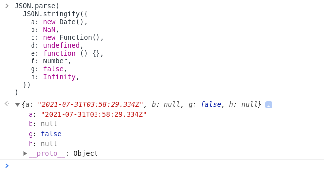 const cloned = JSON.parse(JSON.stringify(original));const cloned = JSON.parse(JSON.stringify(original));By doing this, any property which doesn't have an equivalent type in JSON you will be lost. Moreover, every property that has value undefined will be ignored by JSON.stringify which leads to a lack of properties in cloned objects. Also, some objects are converted to strings, like Date objects for example (also, not taking into account the timezone and defaulting to UTC), Set, Map, and many others:
