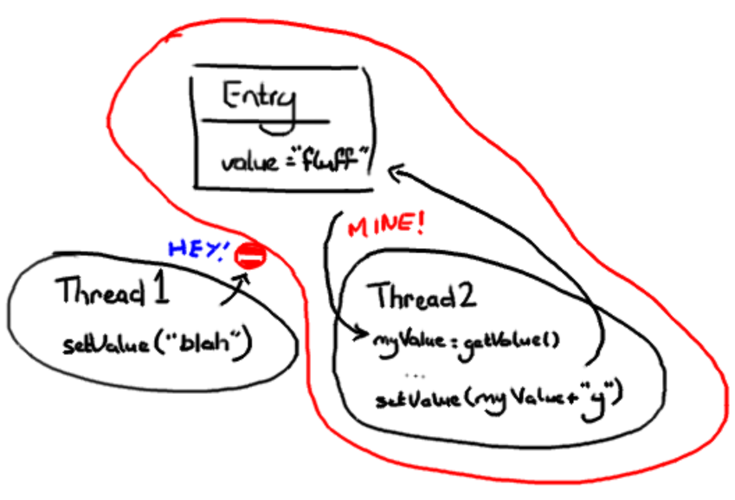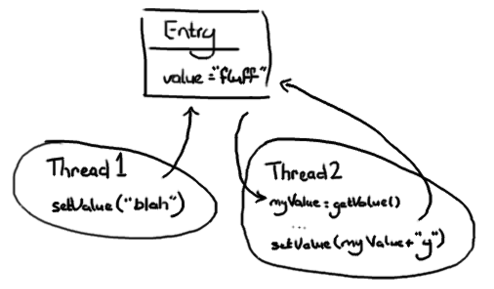2 threads want to manipulate the same variable Source: Dissecting the Disruptor: Why it's so fast (part one) - Locks Are Bad - Trisha Gee