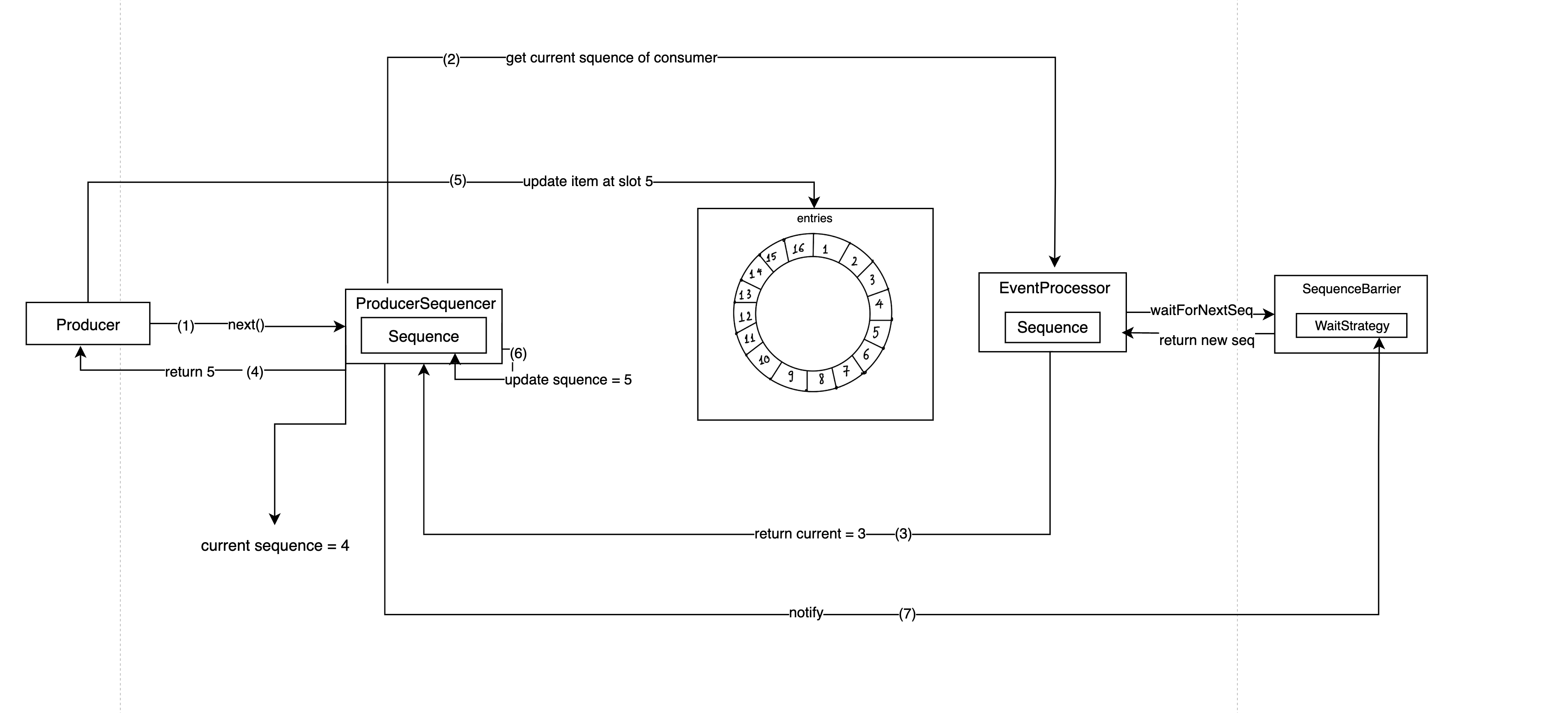 - The ProducerSequencer update its sequence to 5 and notify the SequenceBarrier of consumer