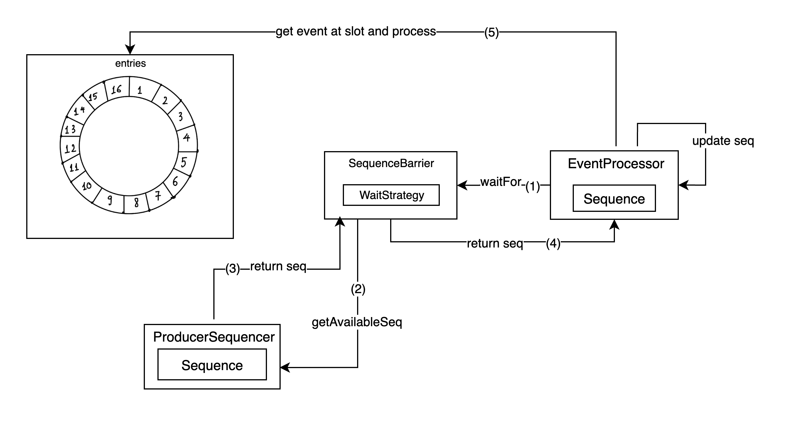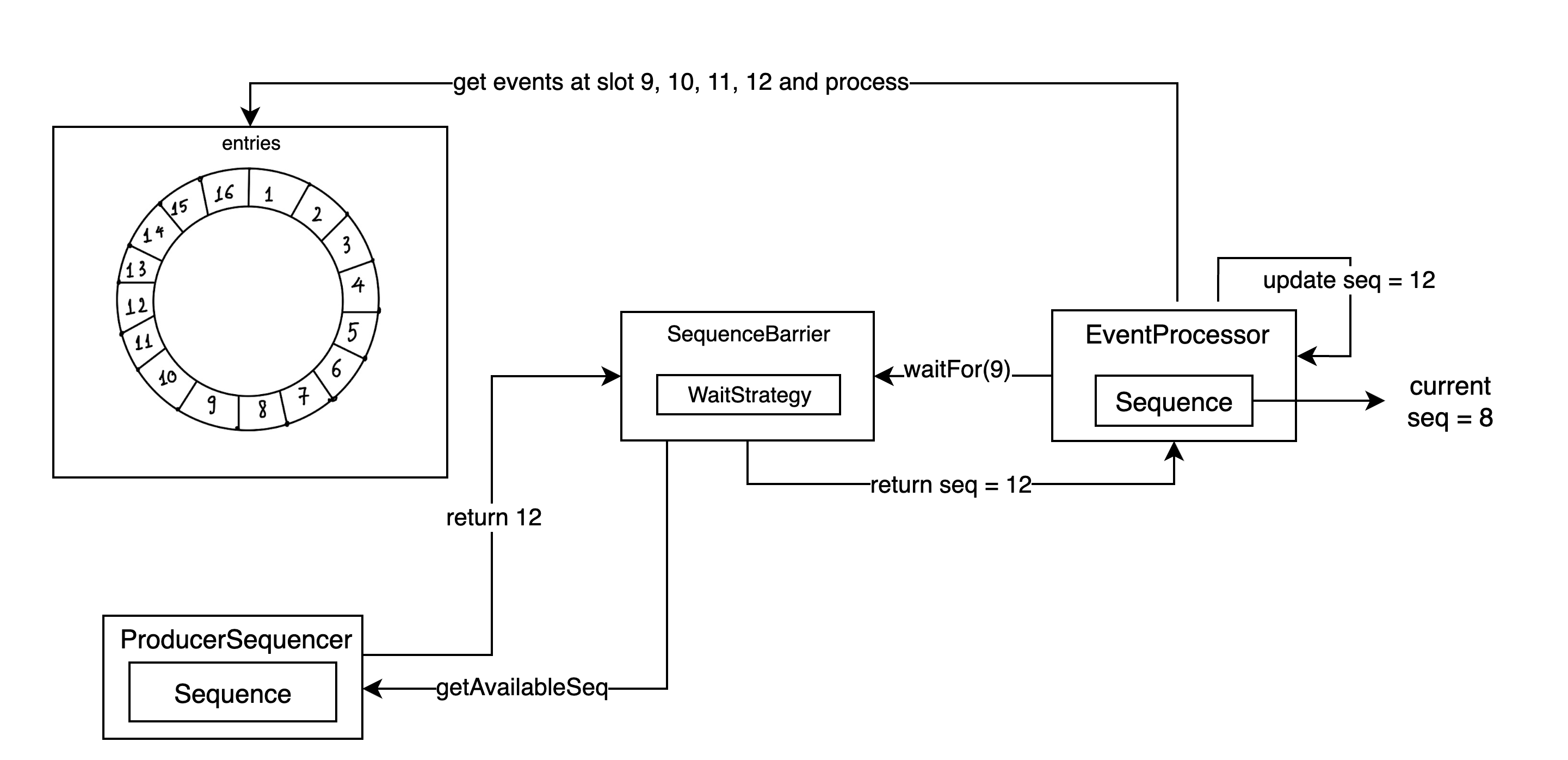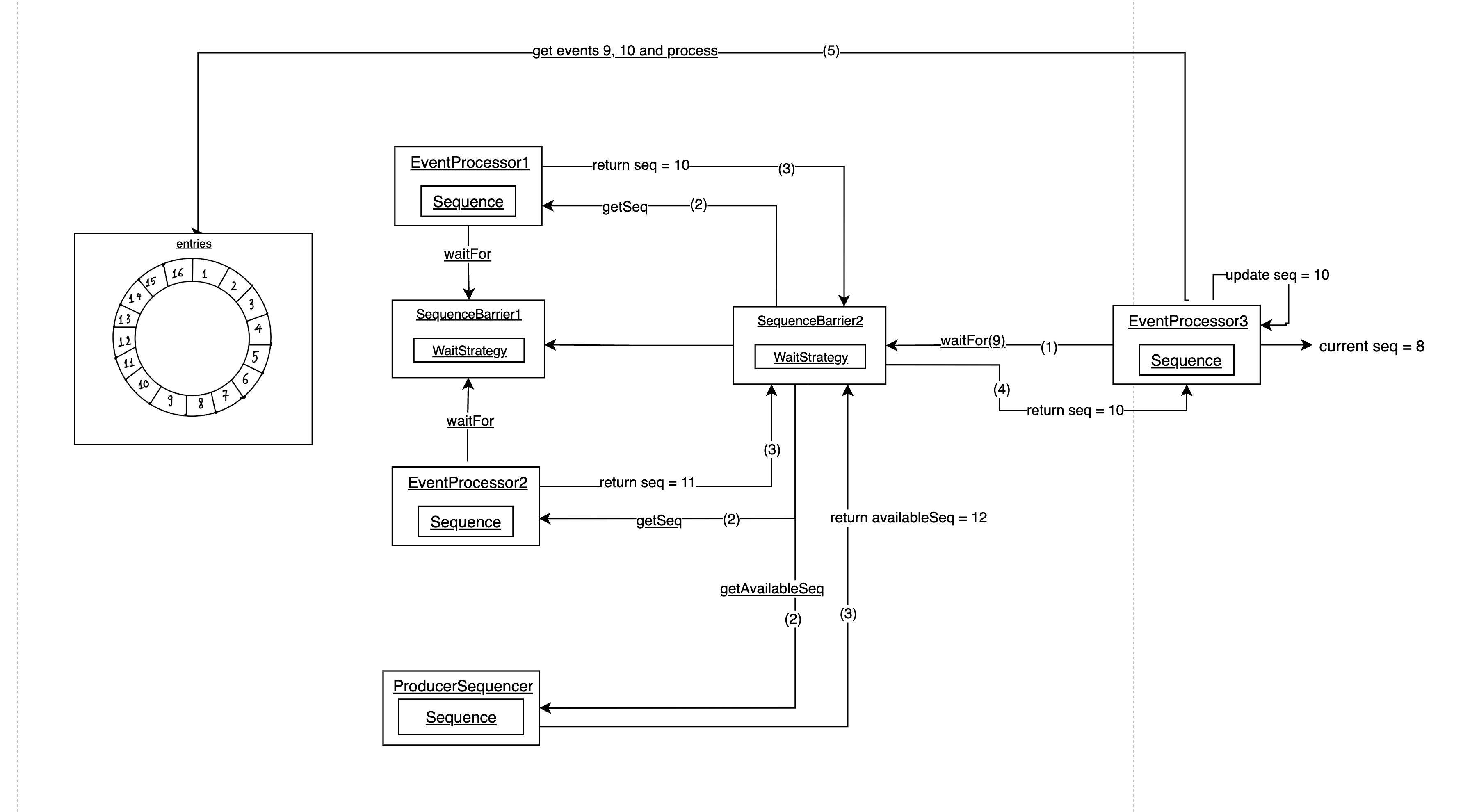 - EventProcessor and Sequence: Each consumer (or EventProcessor) in the Disruptor maintains its own Sequence. This Sequence tracks up to which point in the ring buffer the consumer has processed events. It ensures that consumers only process events that are fully published and ready.