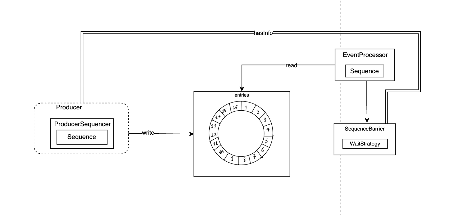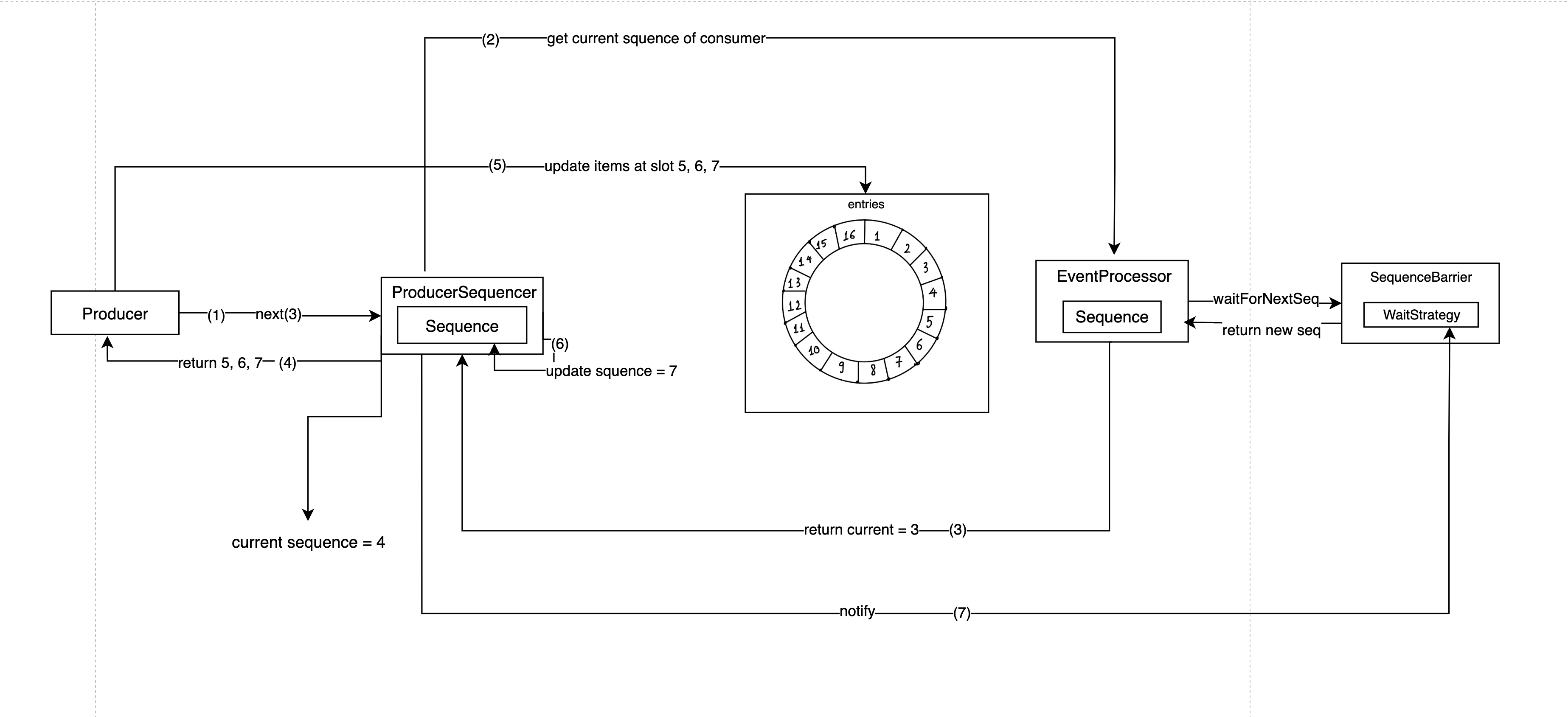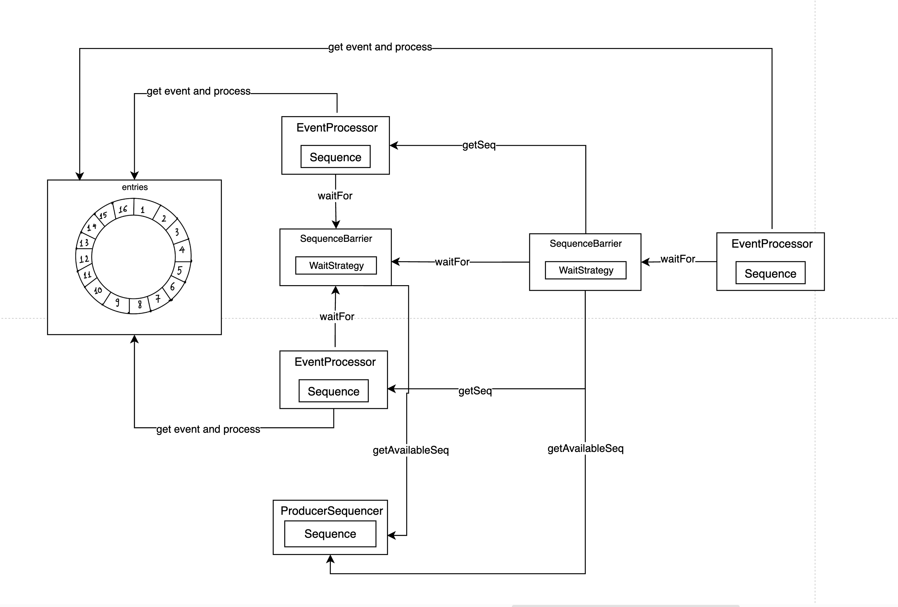 - EventProcessor and Sequence: Each consumer (or EventProcessor) in the Disruptor maintains its own Sequence. This Sequence tracks up to which point in the ring buffer the consumer has processed events. It ensures that consumers only process events that are fully published and ready.
