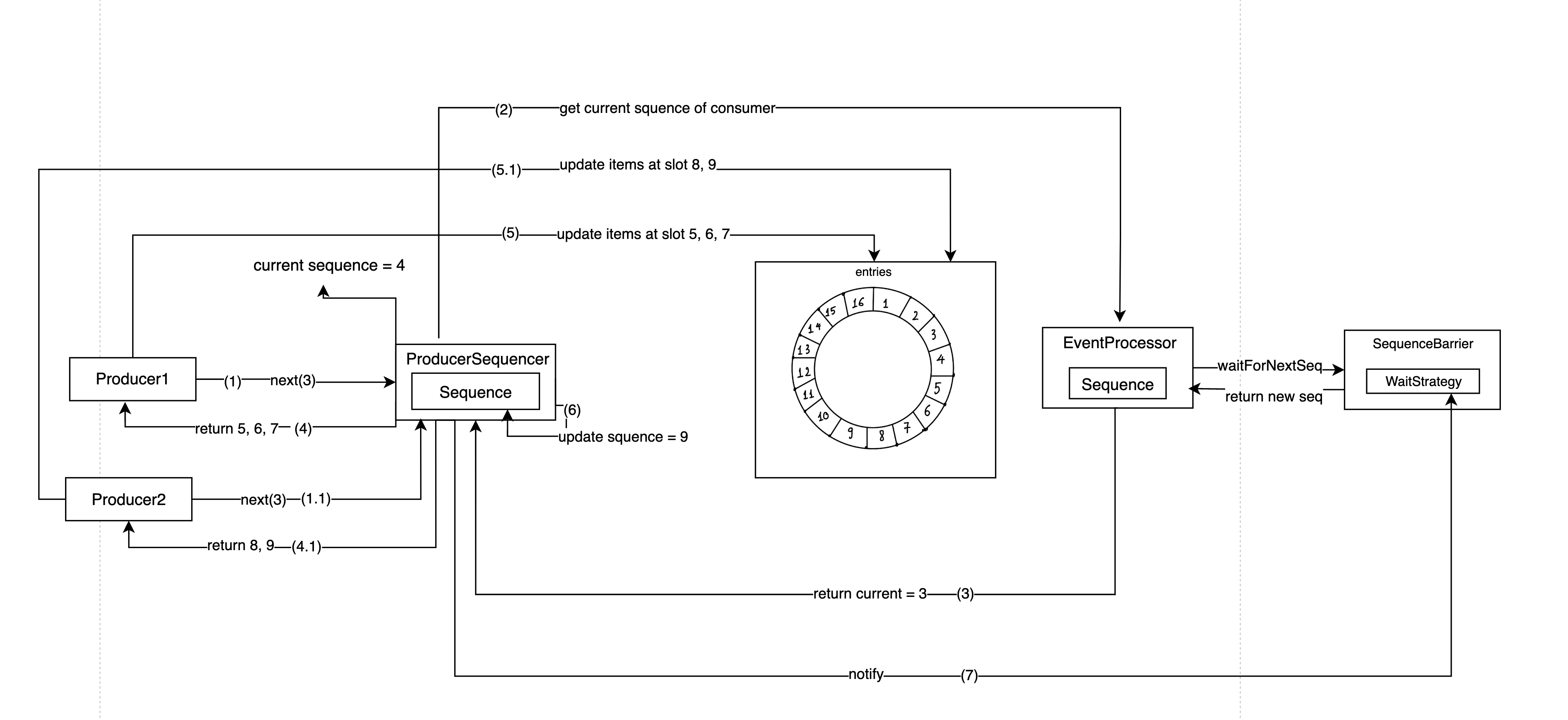 The ProducerSequencer (actually it’s the MultipleProducerSequencer) will be in charge of request and allocate the desired slot(s) for each producer, it uses CAS to deal with the write contention to the producer sequence.