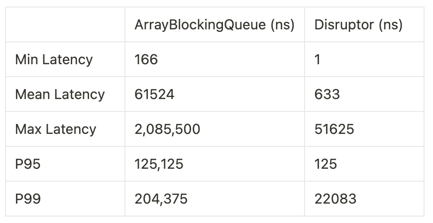 Here is the benchmark between Disruptor and ArrayBlockingQueue