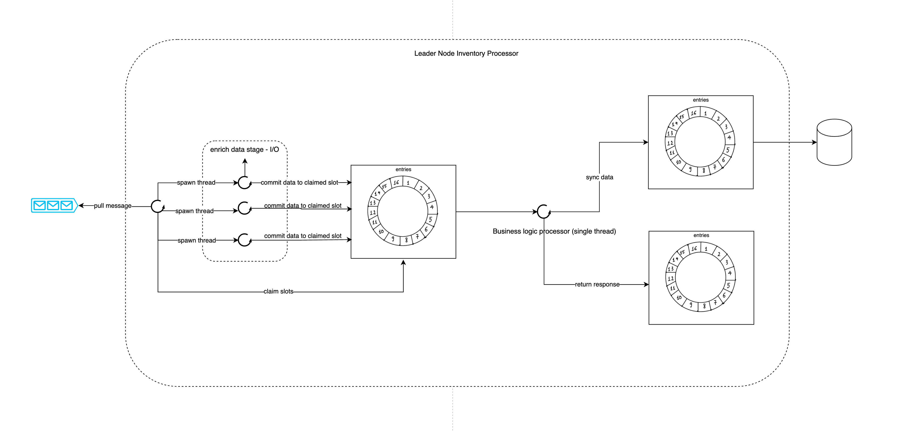 - Leader Node Inventory Processor - single server handles all the traffic for inventory system, this is the one we’ll dive deep in the next section - which utilizes Disruptor