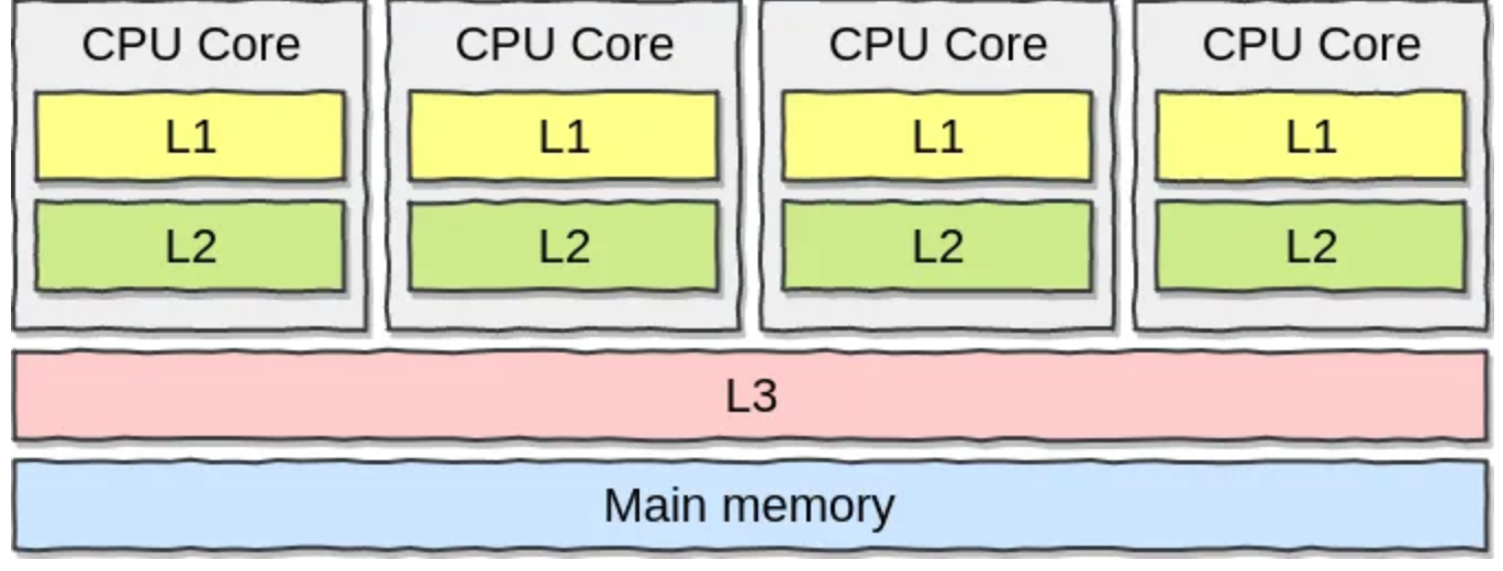 in modern computer nowadays, one CPU will have multiple cores (CPU core), each CPU core has some cache layers (L1 and L2). The CPU has the L3 cache layer, and finally is the main memory.