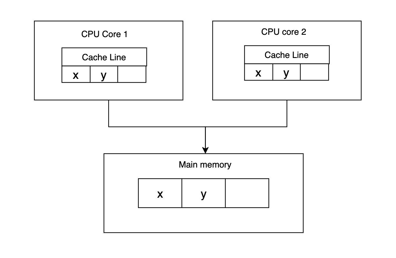 Imagine a scenario where we have two variables, x and y. These exist within the same cache line and are replicated across multiple CPU core caches. For simplicity, we'll overlook the cache layer and focus solely on the cache line.