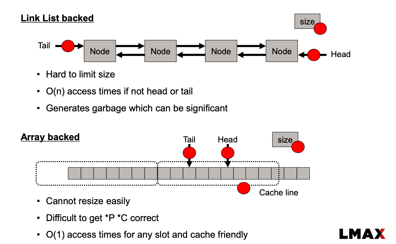 In Java, there is another problem comes from the garbage collector. With queue backed by linked-list, the memory allocation for the new item, and the memory re-claimed for the processed items is a significant problems. Especially when the add/take operations are robust.