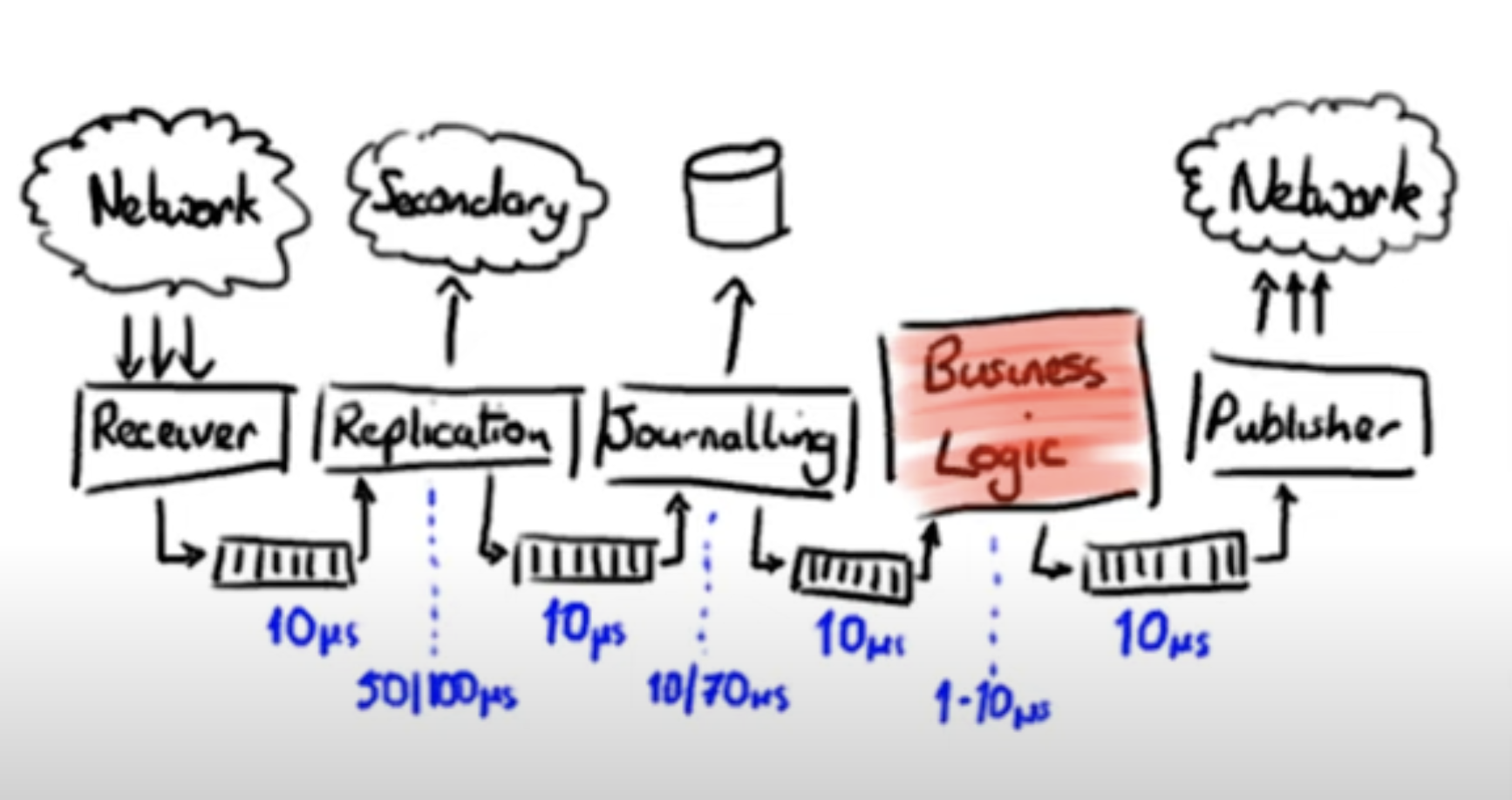 However, as the server must handle additional processing before executing the core logic, the need arises for multi-threading to perform concurrent tasks. To facilitate communication between these threads, queuing mechanisms are commonly employed. For instance, the LMAX system, developed in Java, utilized the ArrayBlockingQueue. Despite expectations, performance testing revealed suboptimal system performance. Conducting analytics on each component identified the bottleneck, revealing the queue as the primary culprit. Below is a high-level diagram depicting the system architecture, along with the processing time of each component.