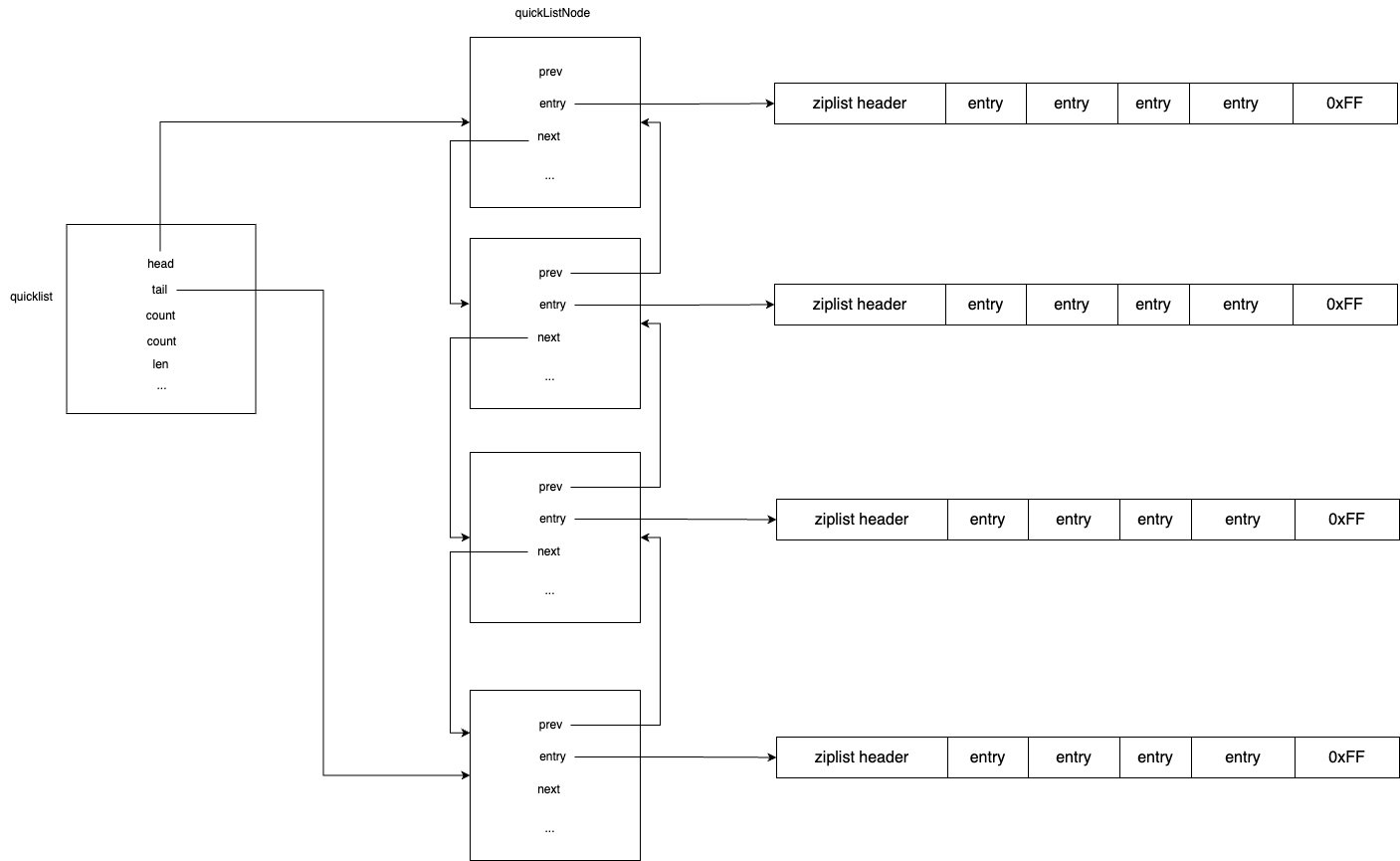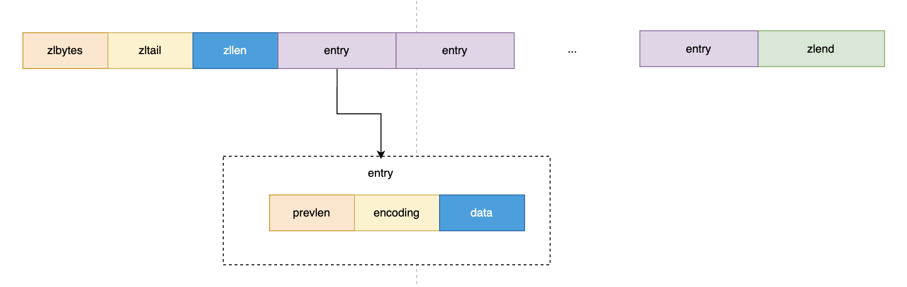 zlbytes(4 bytes): Total size of theziplistin bytes, including header, entries, and end marker. Used for memory management.zltail(4 bytes): Offset to the last entry in theziplist, enabling quick tail access.zllen(2 bytes): Number of entries in theziplist.- Note: When entries exceed