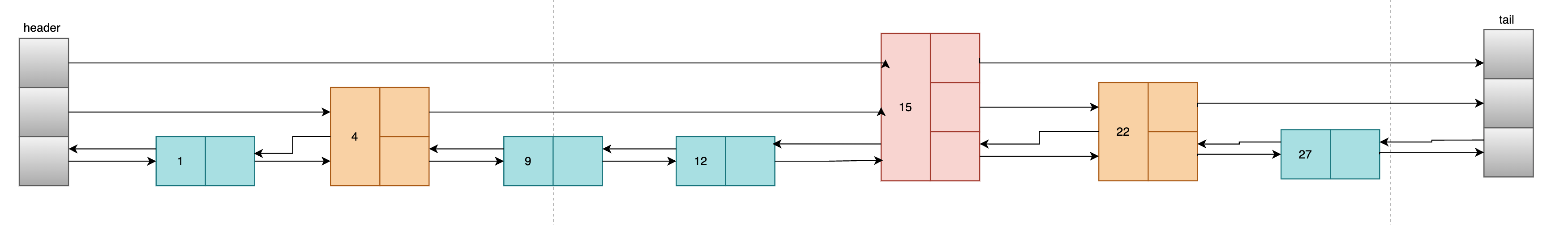 header**,** tail: pointer to theheadandtailnodelength: The number of nodelevel: The number of level