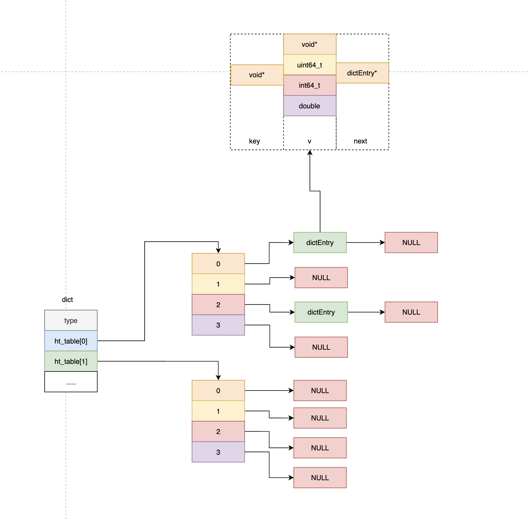 dictEntry **ht_table[2]: Array of two hash table pointers for incremental hashinght_table[0]: Active hash tableht_table[1]: Temporary hash table for rehashing
