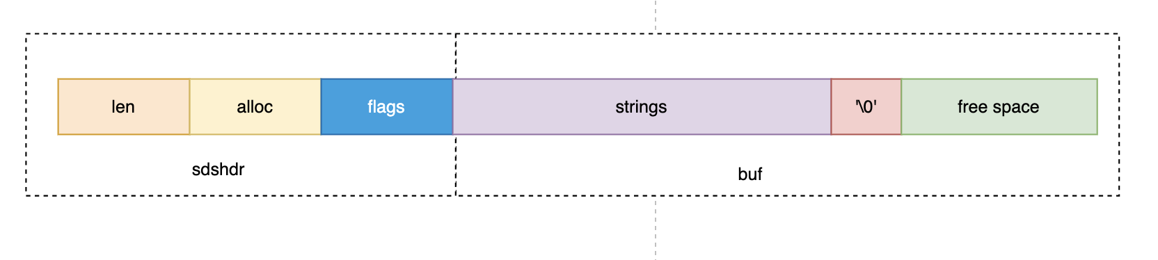 It consists of two parts: the metadata part (sdshdr) and the data part (buf).