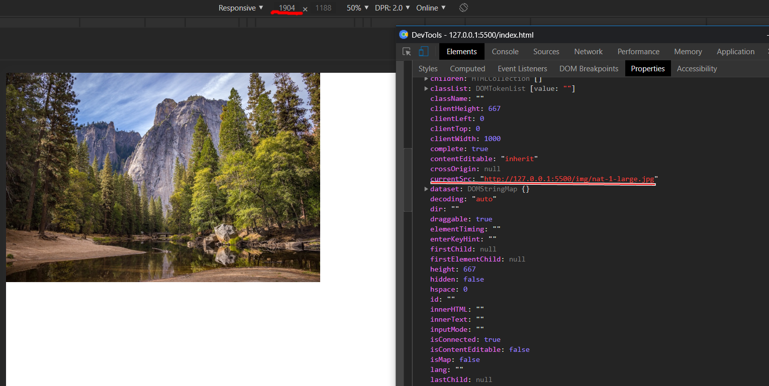 When size of screen is larger than 600px - in this case is 1904px src of image will be ../nat-1-large.jpg. Why is that? Because the size of the screen is 1904px > 600px and it doesn't match any condition, so browser will pick the default value which is 1000px . The size of nat-1-large is nearest to 1000px so it's the one to be set as src of image.