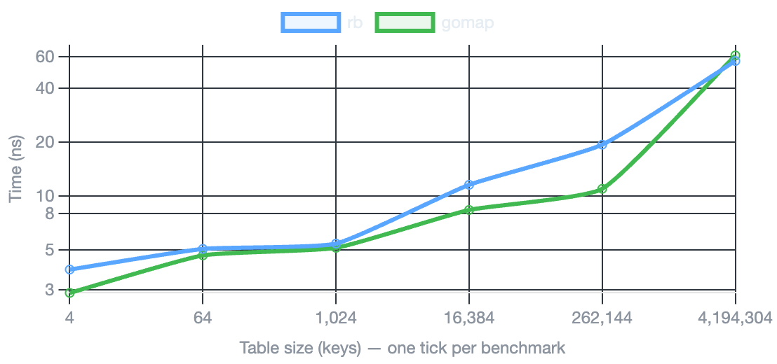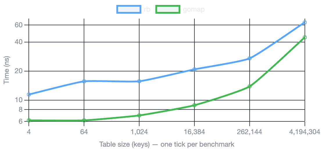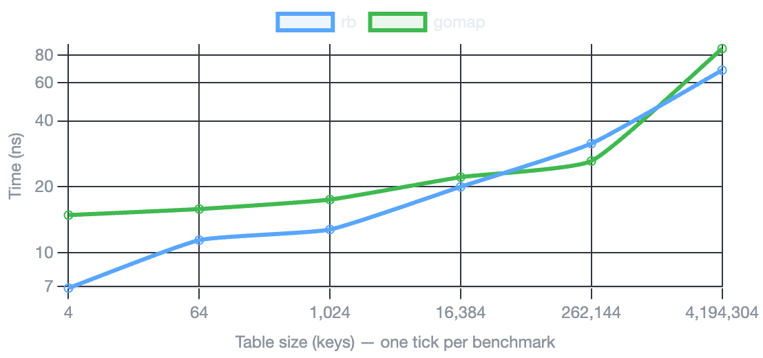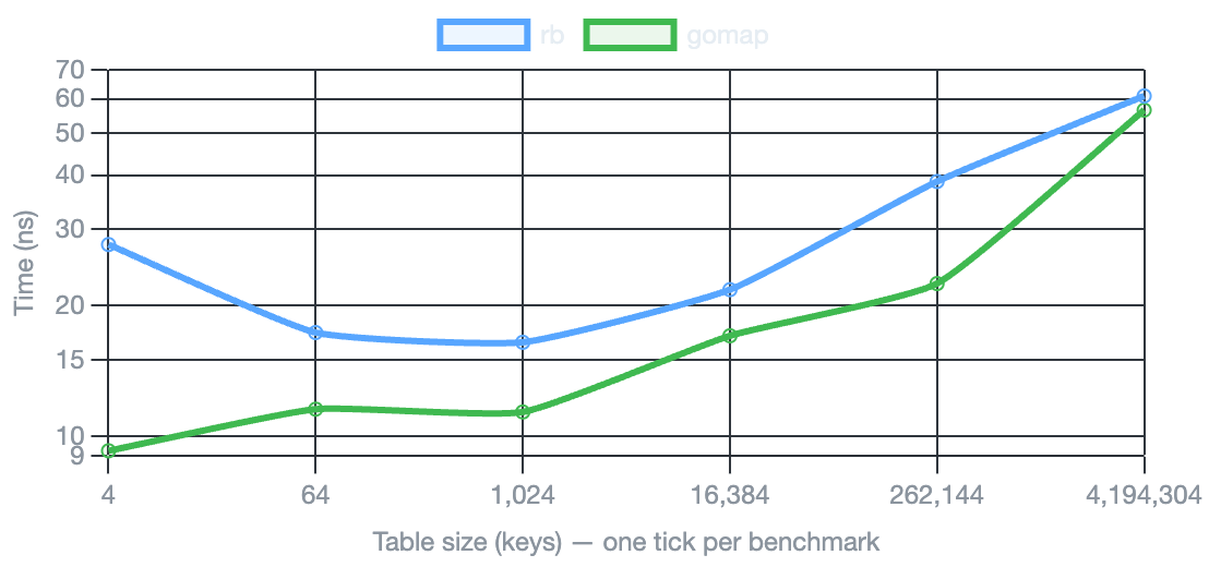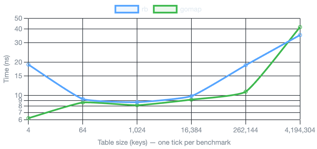 rb- the Robin Hood open-addressing table from this article (loadFactor = 0.5, SplitMix64 forint64keys and FNV-1a forstringkeys).gomap- Go’s built-inmap, pre-sized withmake(..., n)where applicable.