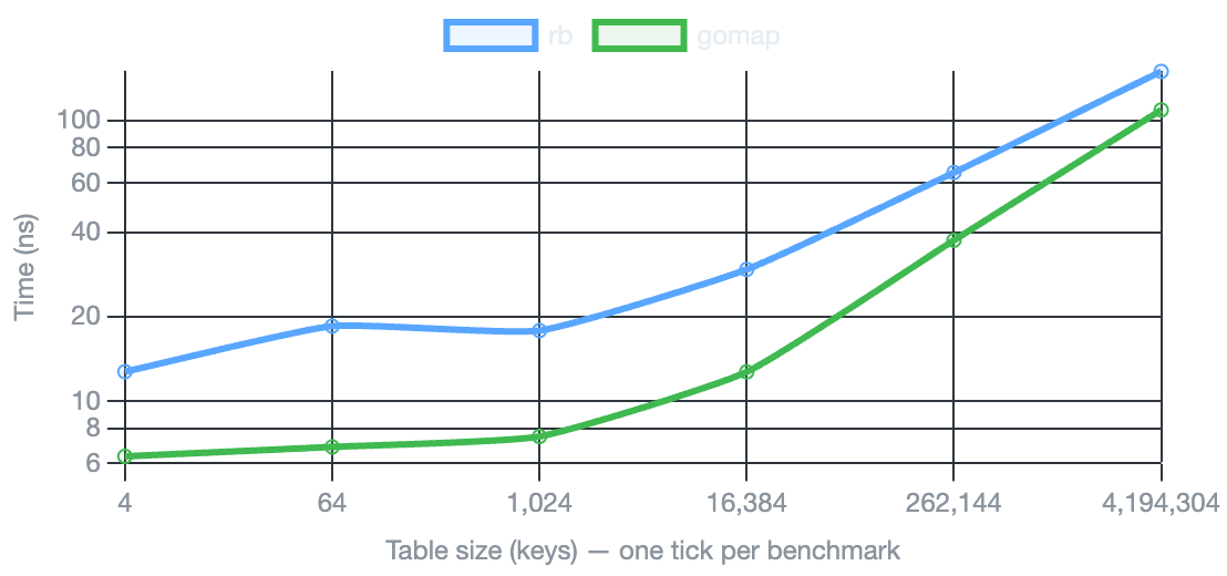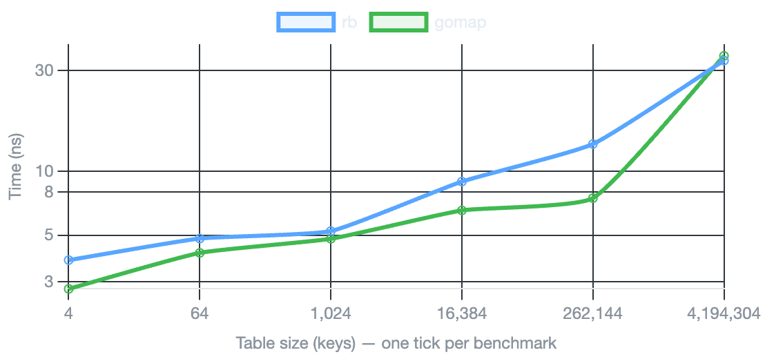 Cache miss: Lookups use a fixed random permutation of indices (rand.Perm(n) once per sub-benchmark). Access order is shuffled but repeatable; for large the table stops fitting in cache, so the curve stresses pointer-chasing / cache-miss behavior rather than sequential locality.
