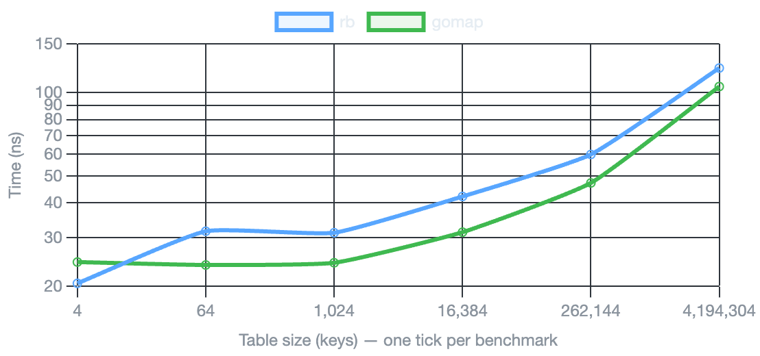 Hit lookup: The table is filled once before timing (not included in the loop). Each iteration does one successful Get in sequential order over the key slice, so the access pattern is cache-friendly for the key array.