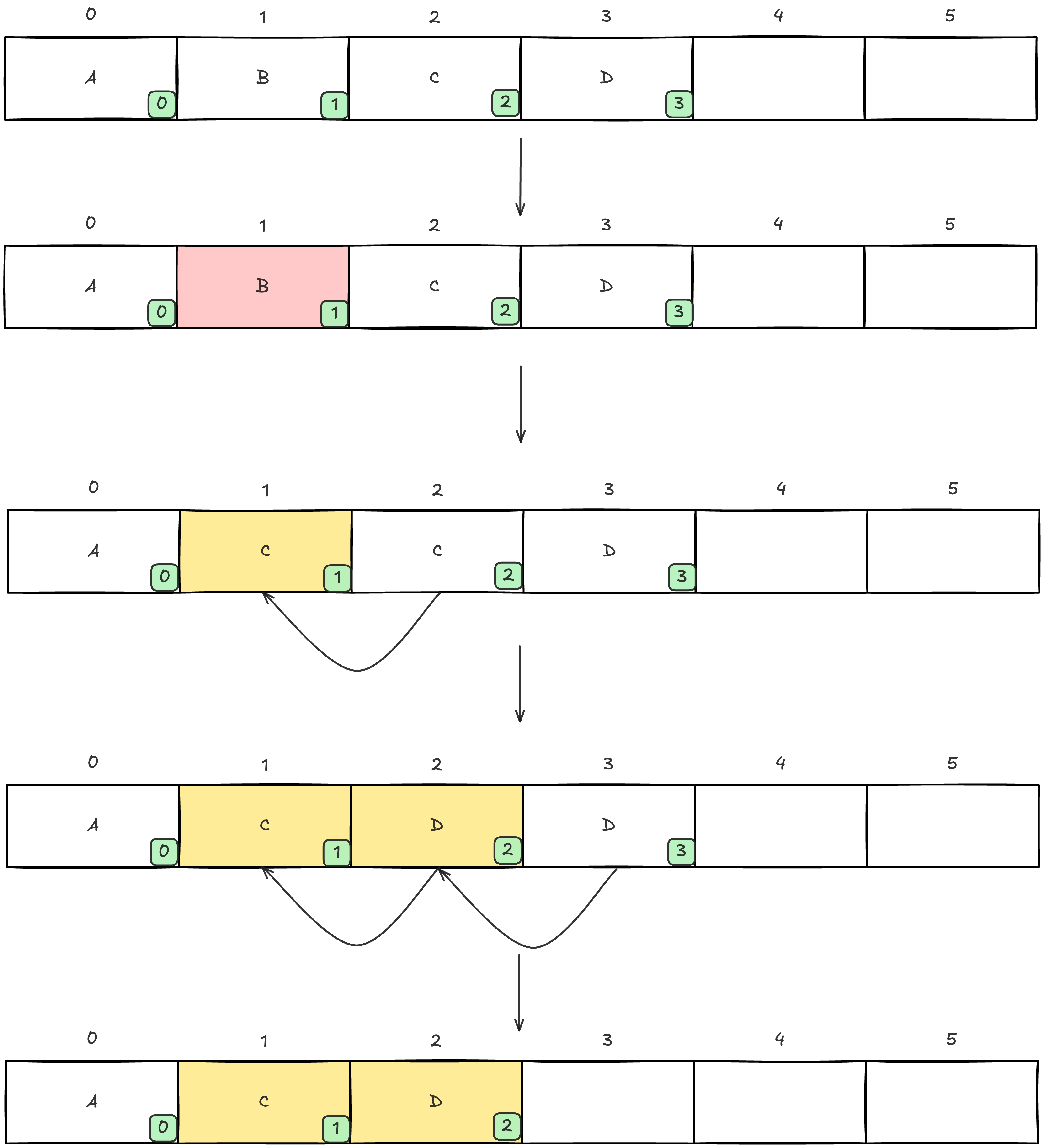 }After removing the target entry, each following entry shifts one bucket to the left and its DIB decreases by 1. This continues until the next bucket is empty (dib < 0) or contains an entry already in its home bucket (dib == 0). The sentinel with dib == 0 stops the run in the same way.