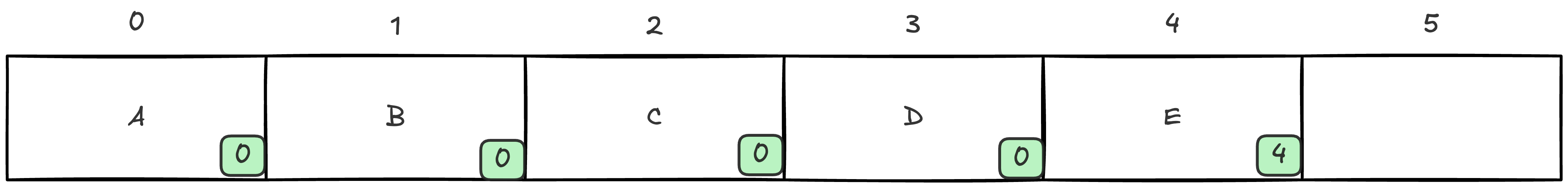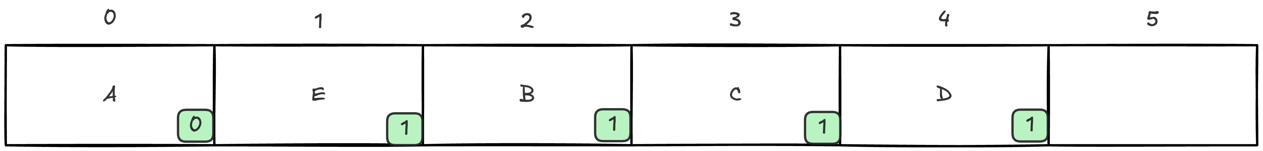 DIB: 0 1 1 1We can also observe that, in Robin Hood hashing, colliding keys tend to end up adjacent to one another, and their DIB values form a non-decreasing sequence. This is one of the key properties that enables an important lookup optimization.