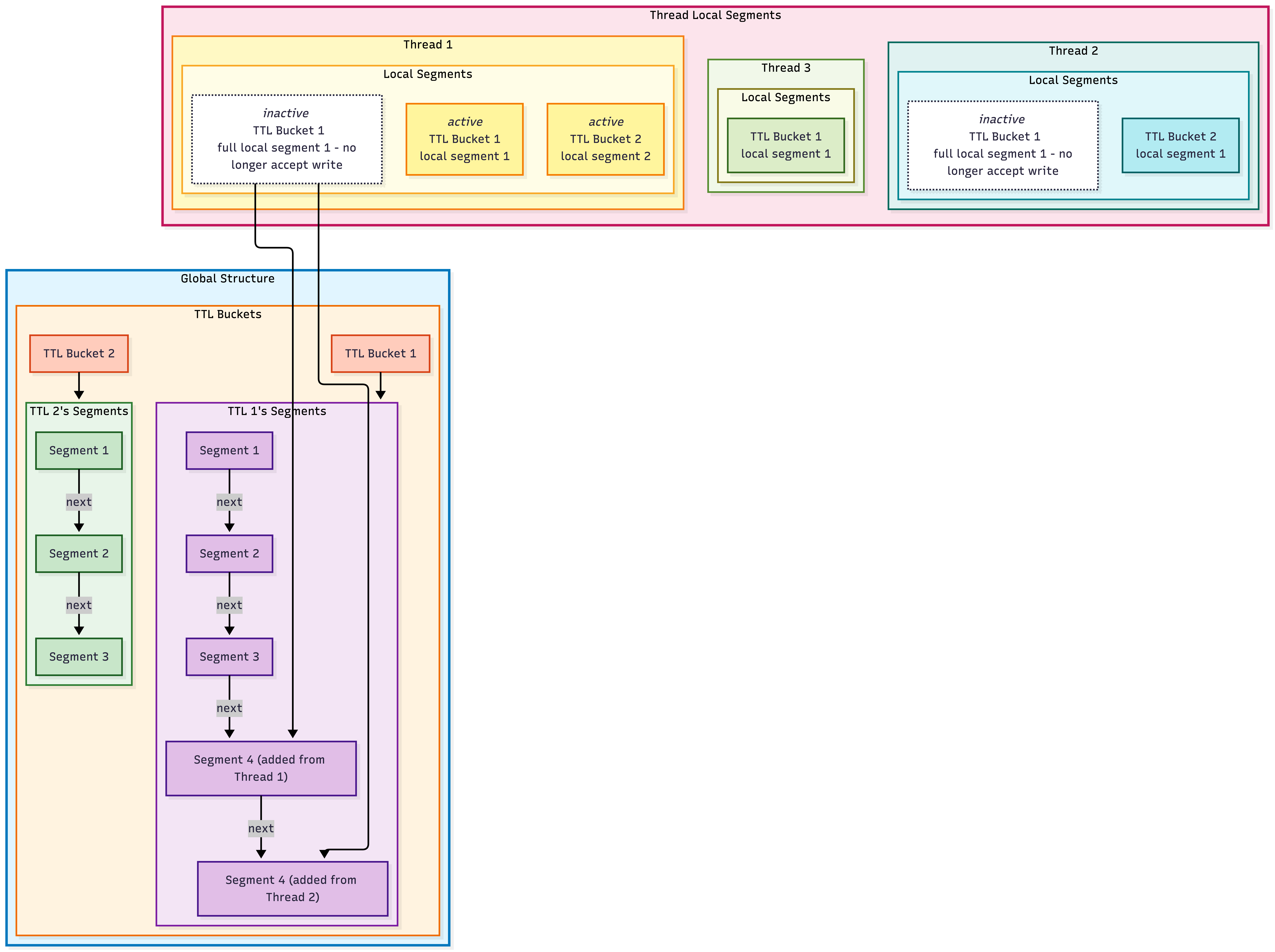 For example, if there’s write to the TTL Bucket 1 in Thread 1, Thread 1 will have its own segment for the TTL Bucket 1, all following write will go to that local thread segment.