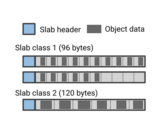 Systems such as Memcached use a slab-based memory allocator to mitigate external fragmentation and reduce allocation overhead. Memory is partitioned into predefined slab classes, where each class corresponds to a fixed object size. Each slab class manages one or more slabs, and each slab is further divided into equal-sized slots.