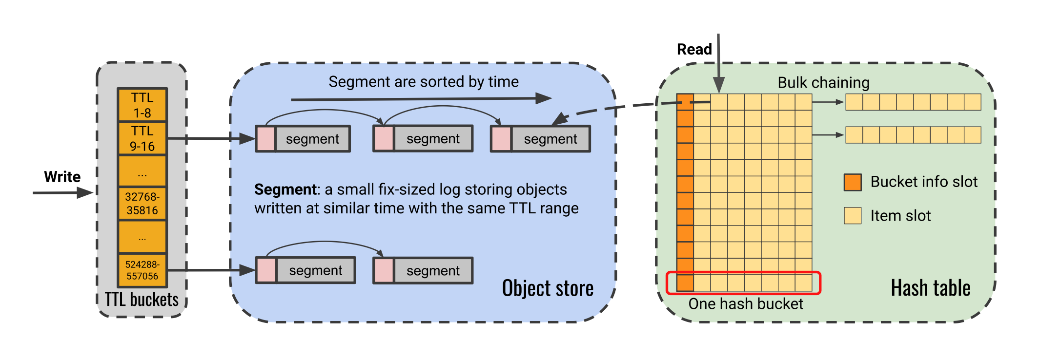 As SegCache only uses hash table to store the location of the object in the segment (segment_id and offset), so it adopts a smarter way called bulk chaining, which is already used in systems like MICA or Faster.