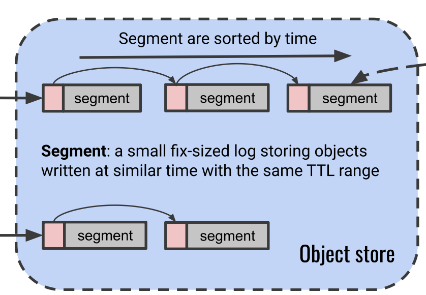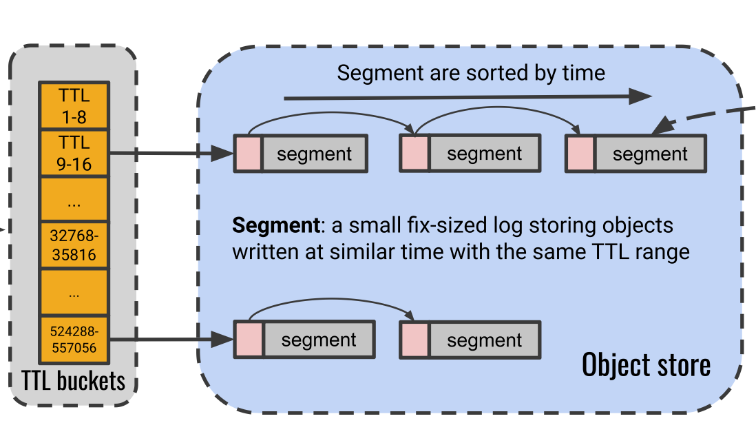 In SegCache, objects in one segment are written sequentially and have the same TTL and segments linked in each TTL bucket are ordered by creation time and have the same TTL. So it’s feasible to proactively remove the expired objects in bulk.