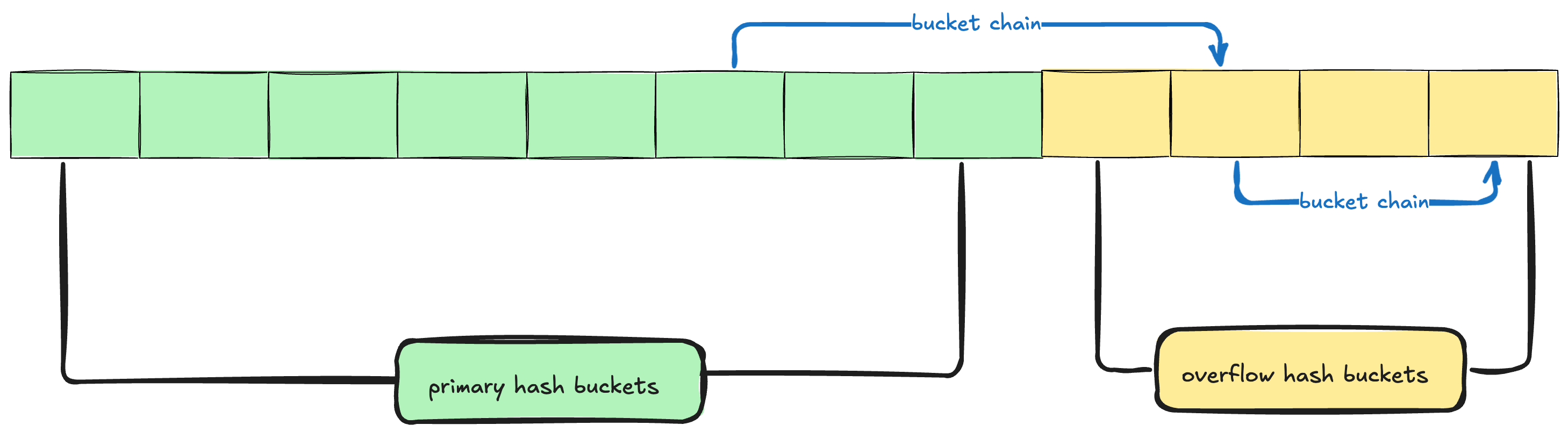 - If the overflow bucket runs out of slots, it will link to another overflow bucket, until we don’t have any available overflow bucket left.