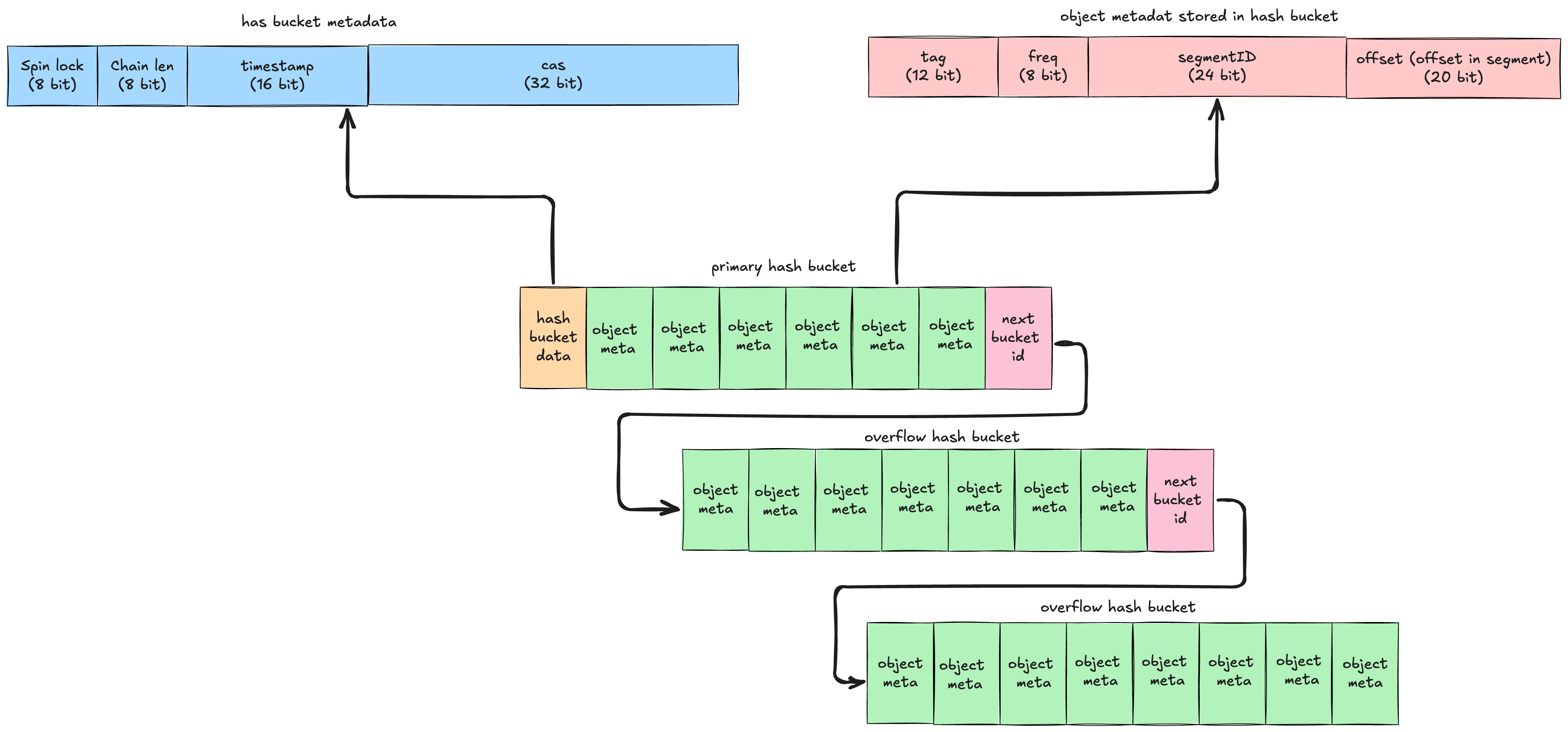 In SegCache, each hash bucket has size of 64 bytes, divided into 8-byte slots - so basically, one hash bucket holds 8 slots. The first slot store the hash bucket information, following 6 slots store object metadata, the last slot either stores the object metadata or the index of the next hash bucket which stores the data of objects having the same hash value.